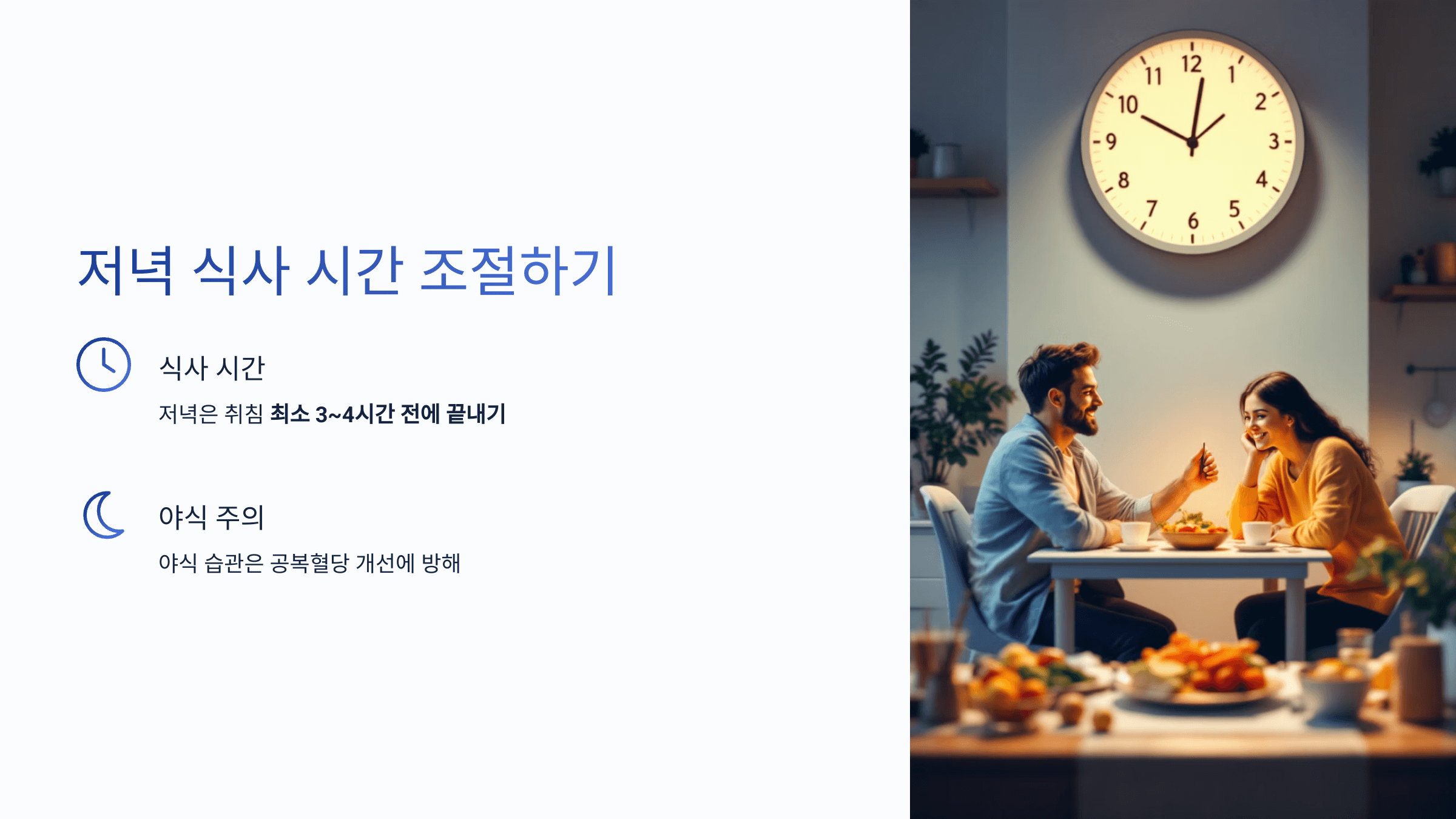 공복혈당을 낮추고 싶다면 저녁 식사는 최소 3~4시간 전에 끝내야 해요.