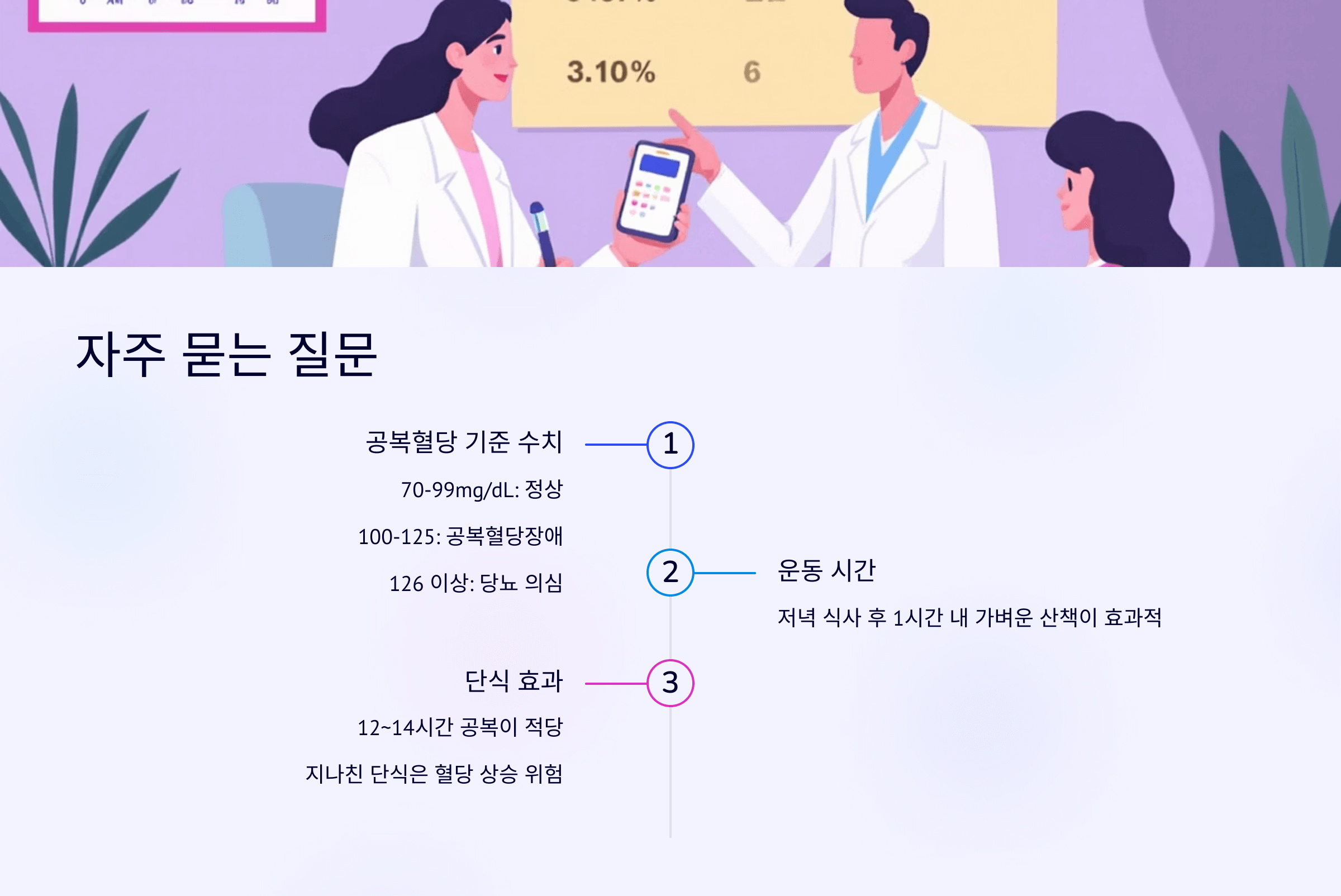 → 저녁 식사 후 1시간 내 가벼운 산책이 공복혈당 조절에 효과적이에요. - 단식하면 공복혈당이 낮아지나요?