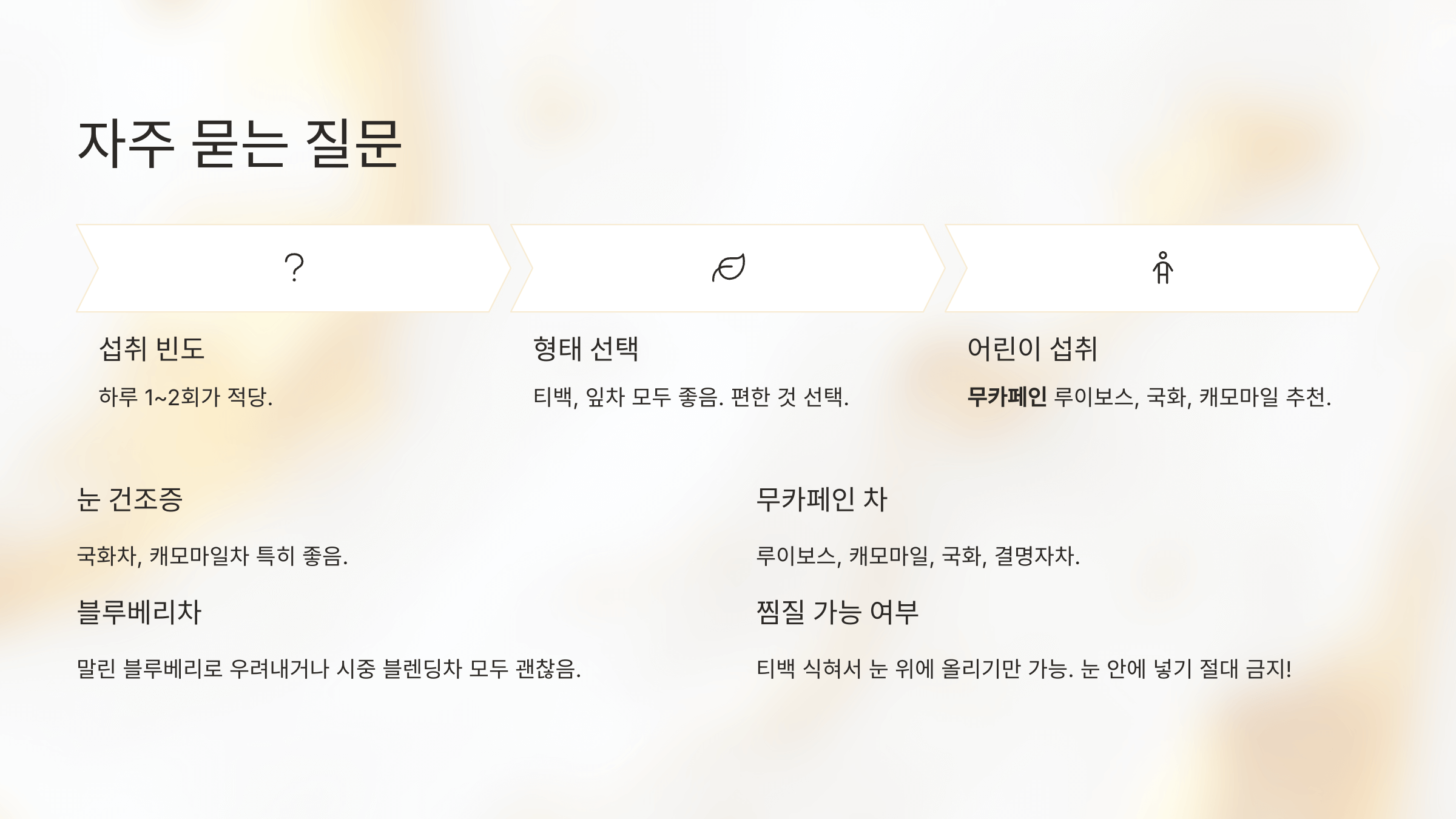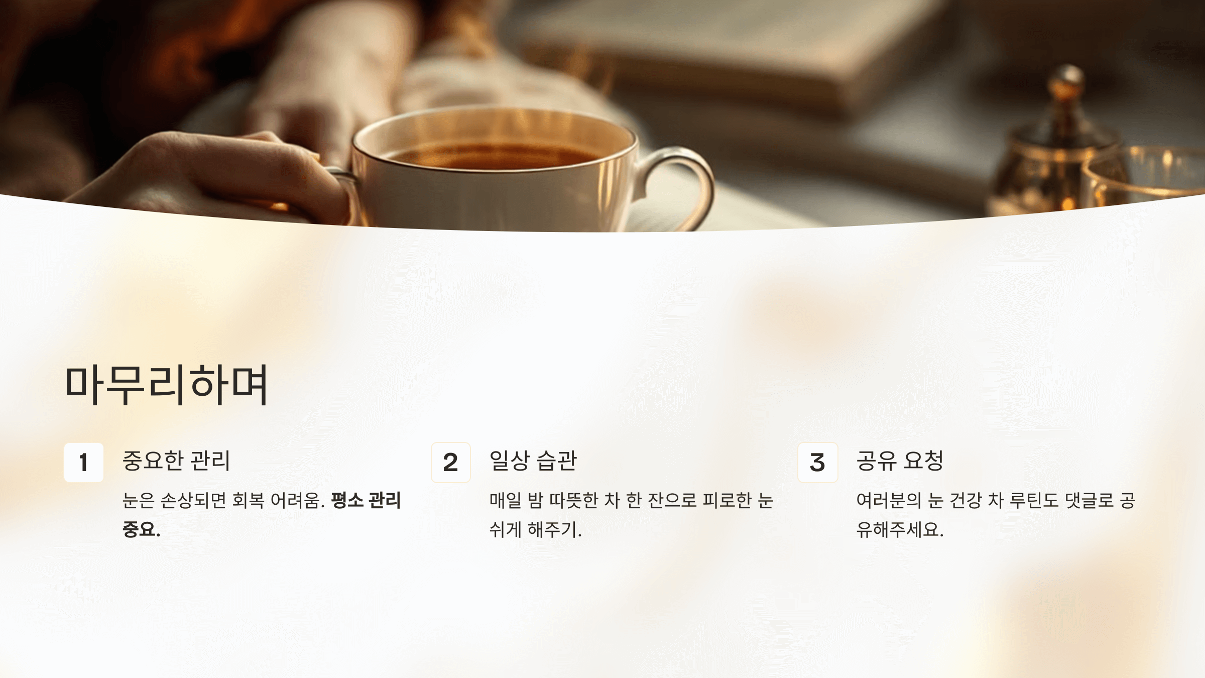 여러분도 오늘부터 차 한 잔 습관으로 눈 건강 챙겨보시는 건 어떨까요?