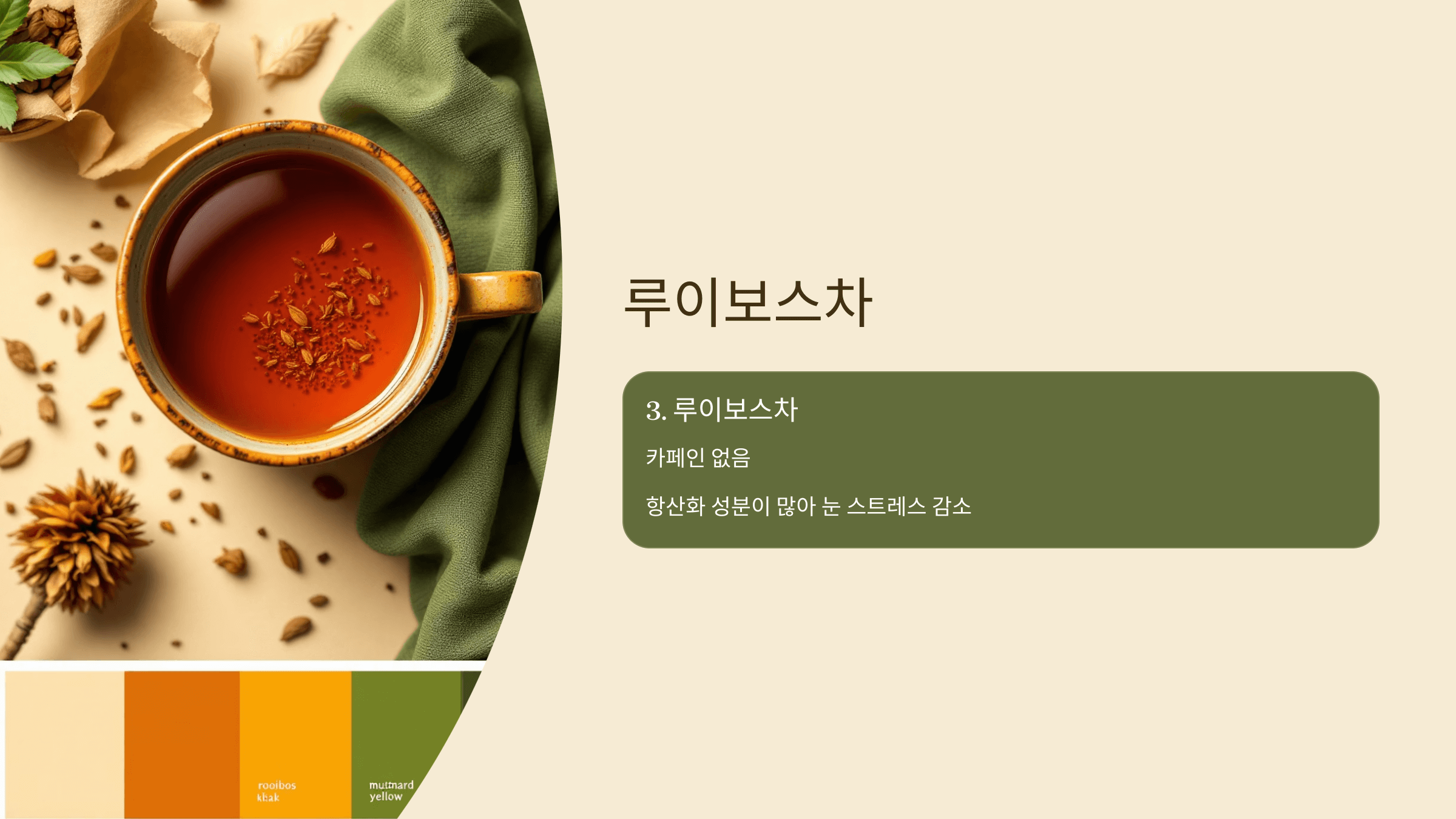 - 카페인 민감하신 분은 국화, 루이보스, 캐모마일 위주로 선택하세요.