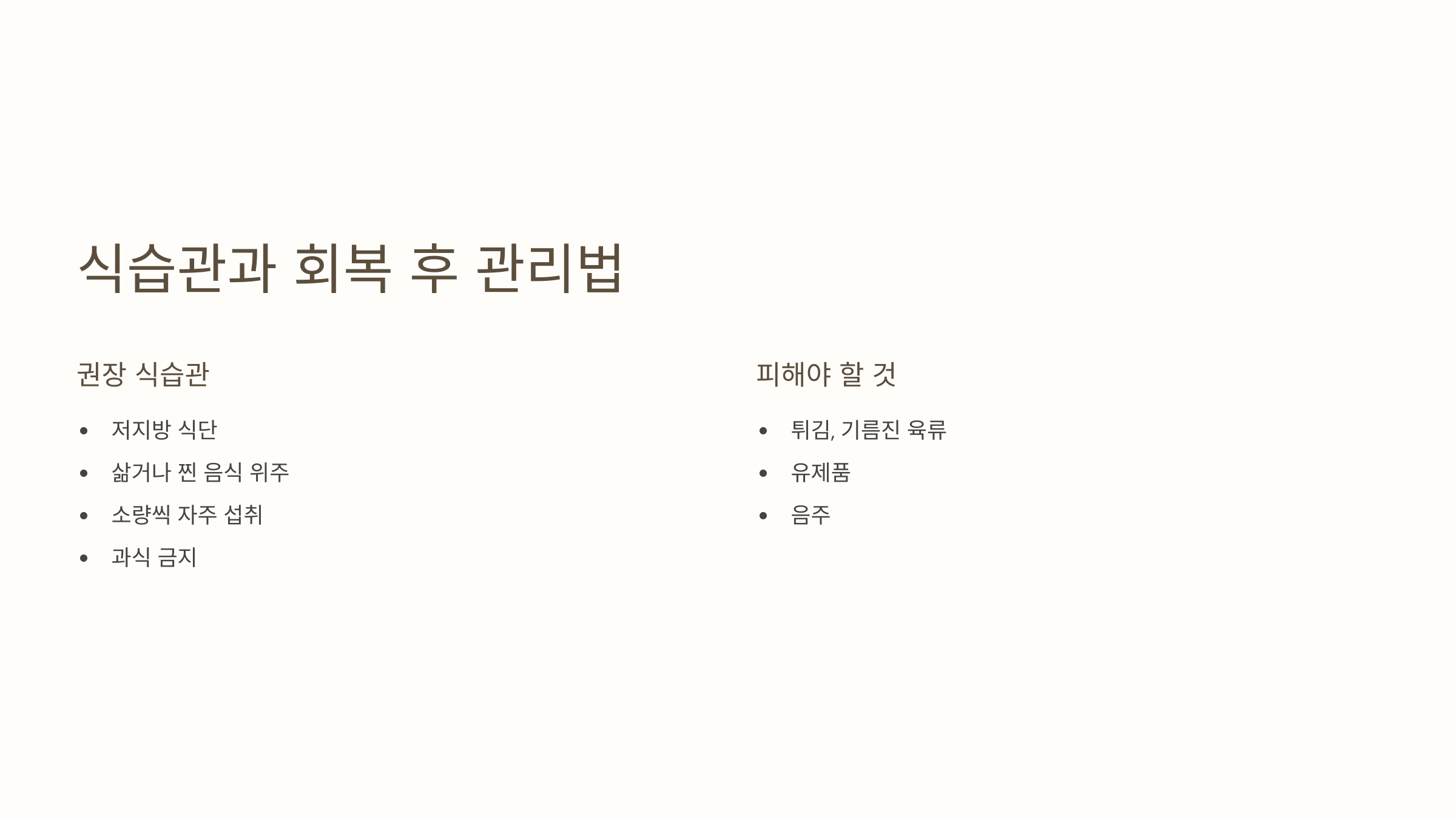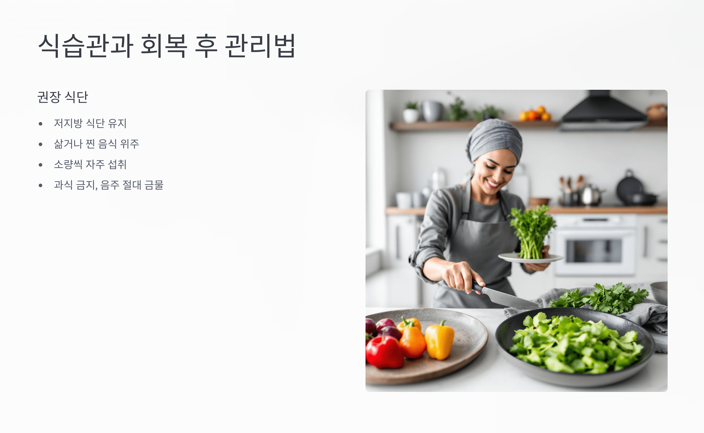 회복기에는 담즙이 잘 분비되지 않아 소화가 약해지므로 자극 없는 저지방 식단이 기본입니다.