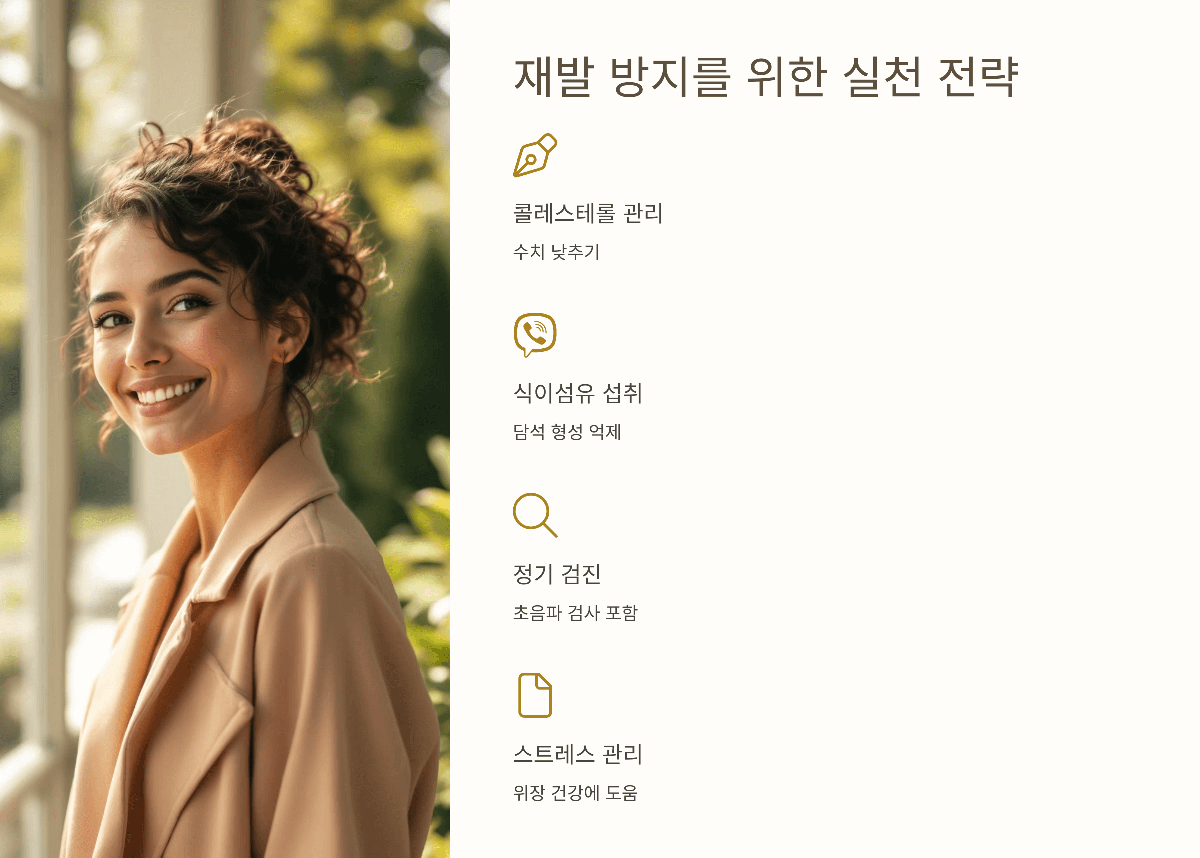 정기적인 건강검진과 초음파 검사로 담낭 상태를 확인하고, 스트레스를 줄이는 생활습관도 중요해요.