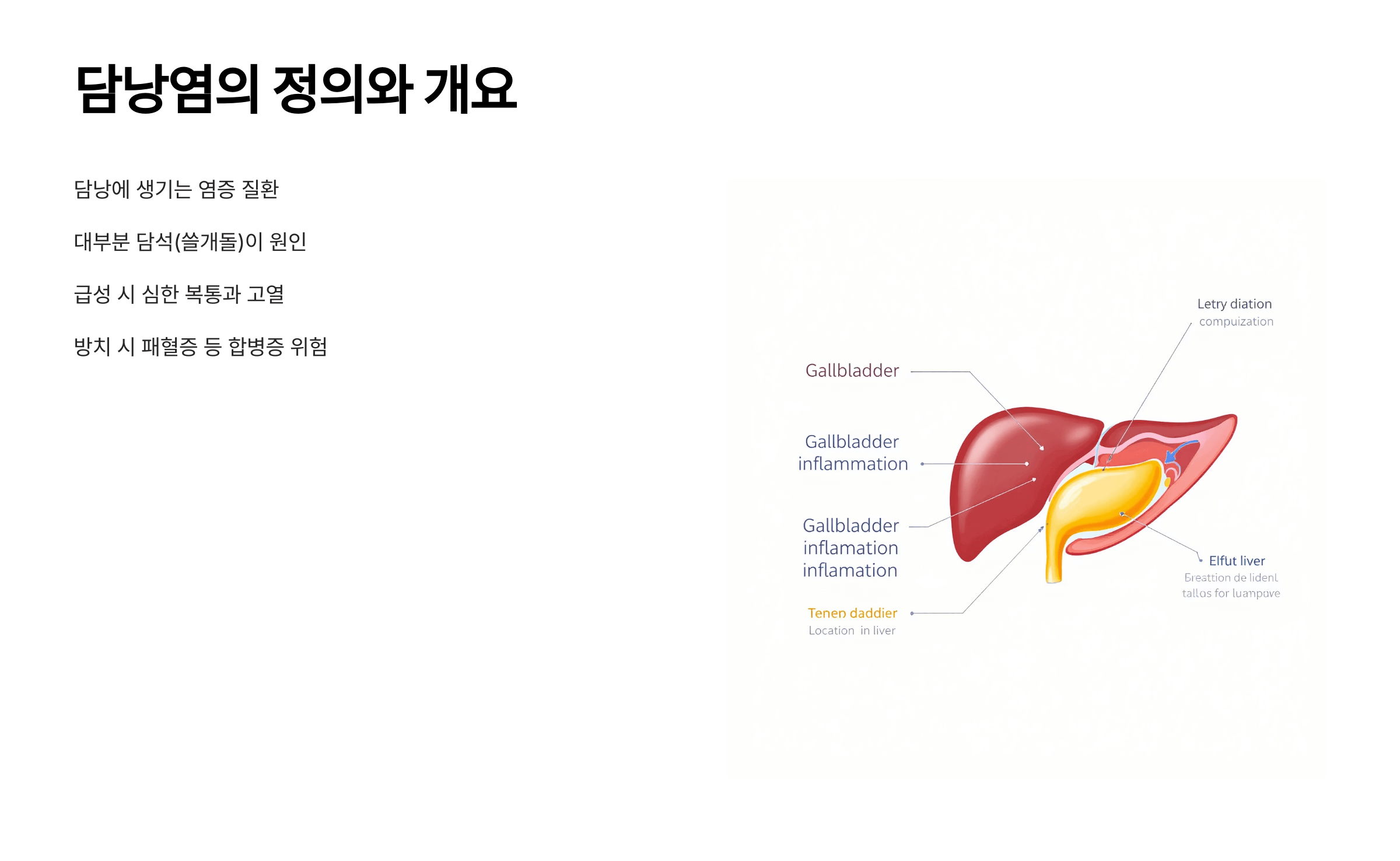 담낭염은 간 바로 아래 위치한 담낭(쓸개)에 염증이 생기는 질환으로, 대부분 담석(쓸개돌)이 원인이 되어 발생합니다.