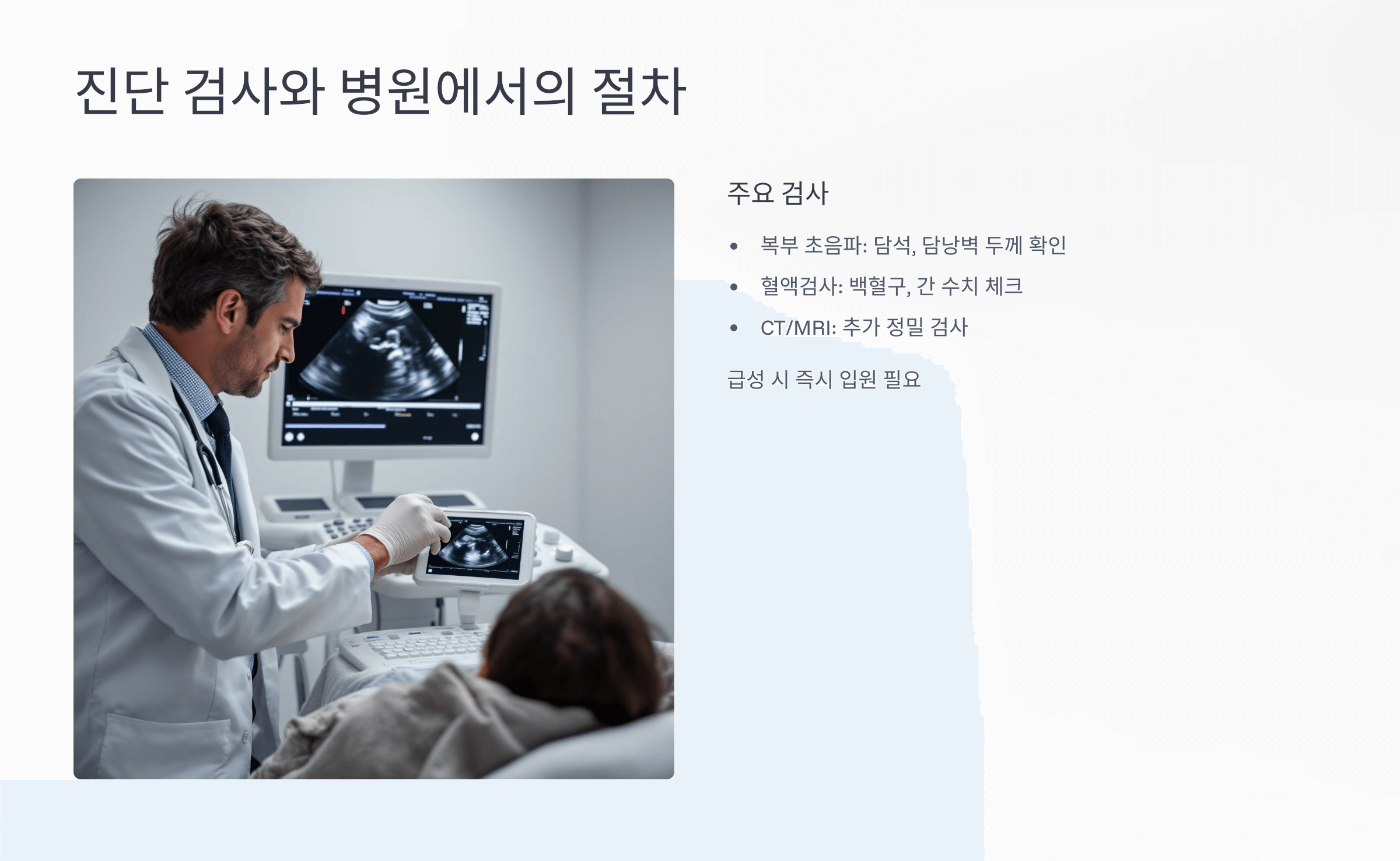 초음파로 담석의 존재, 담낭 벽의 두께, 염증 여부를 확인하고, 혈액검사에서는 백혈구 수치와 간 수치를 체크해요.