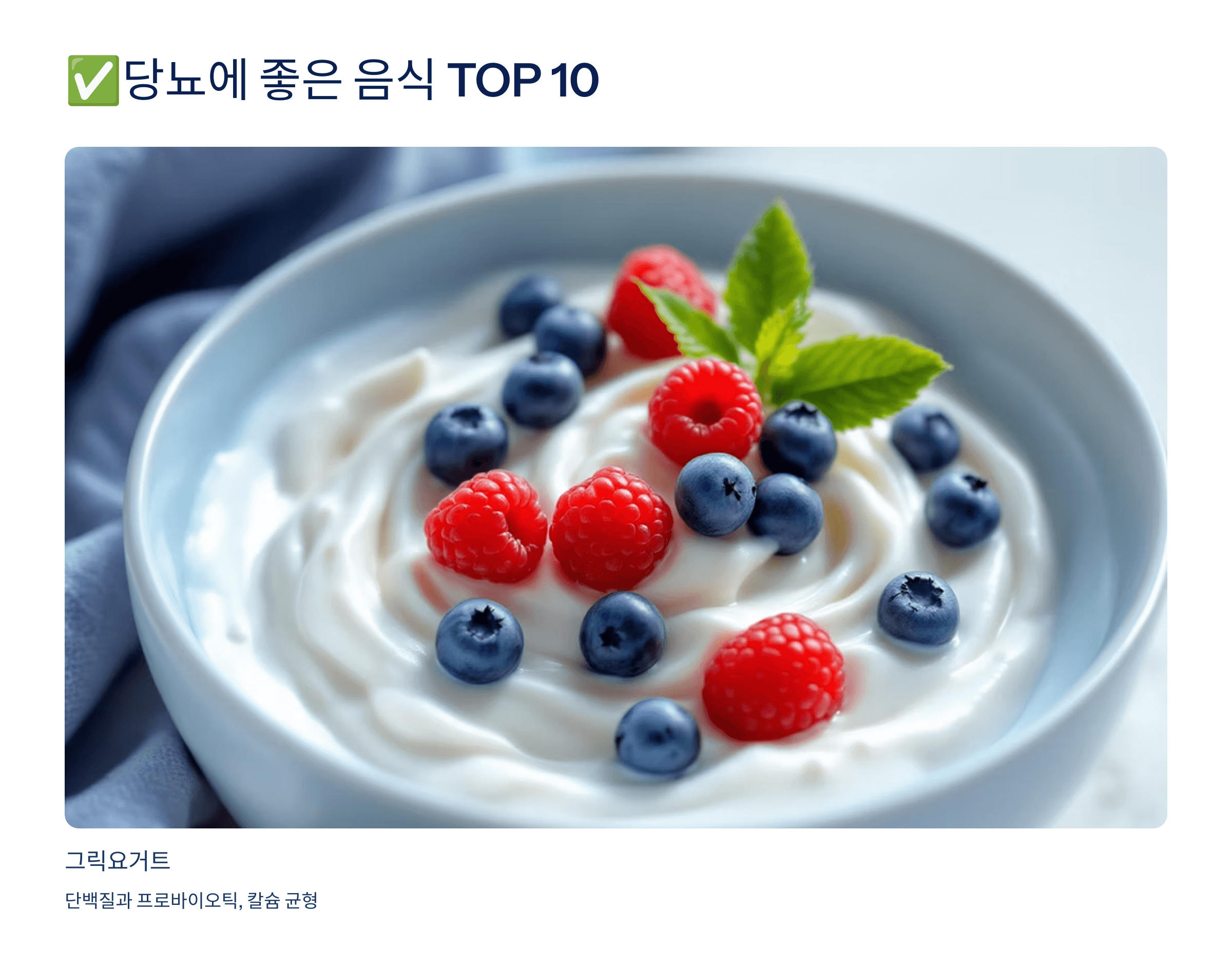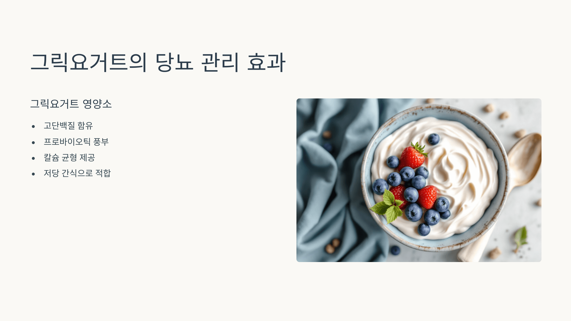 단백질과 프로바이오틱스가 풍부해 장 건강과 혈당 안정에 도움이 됩니다.