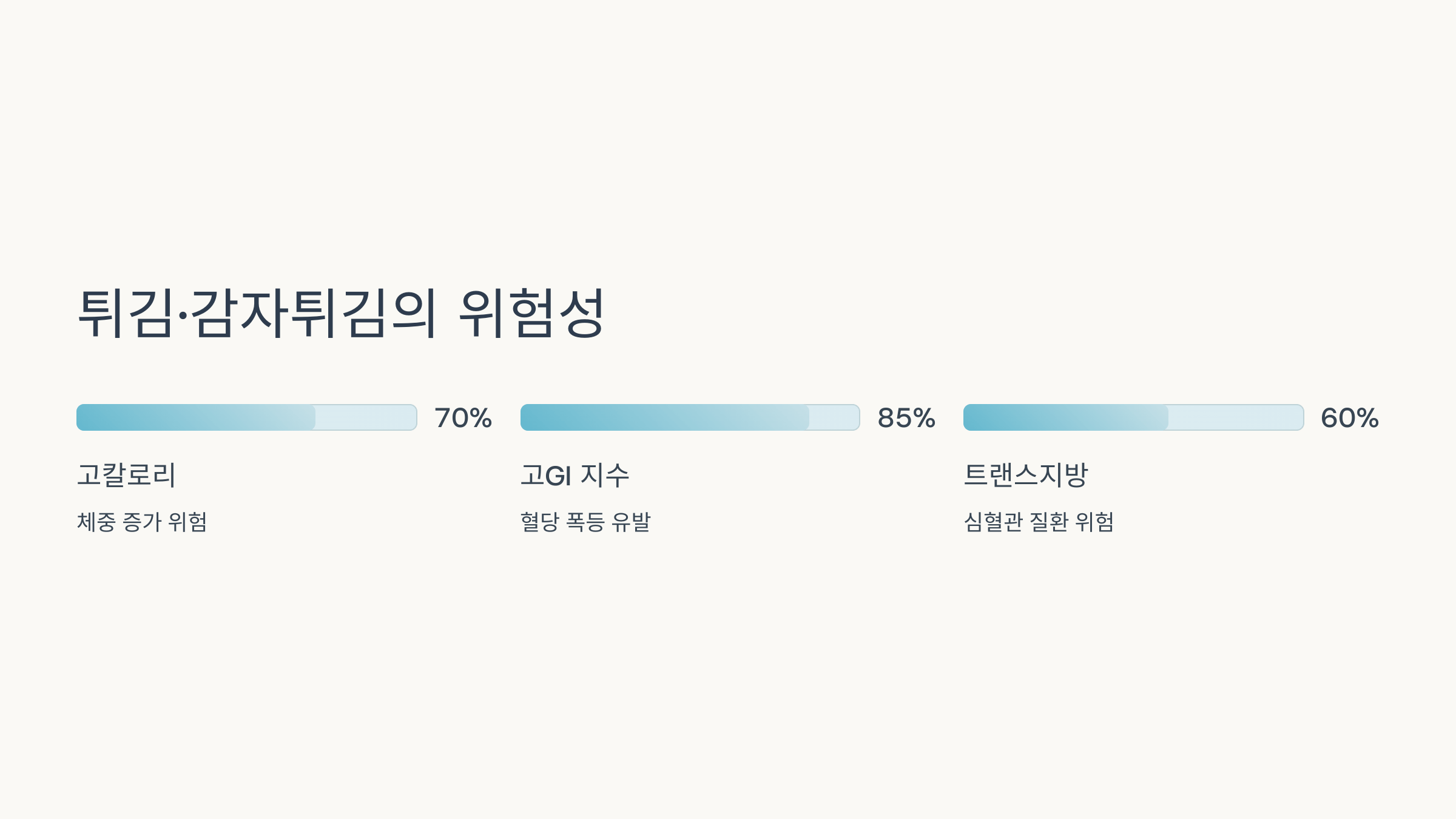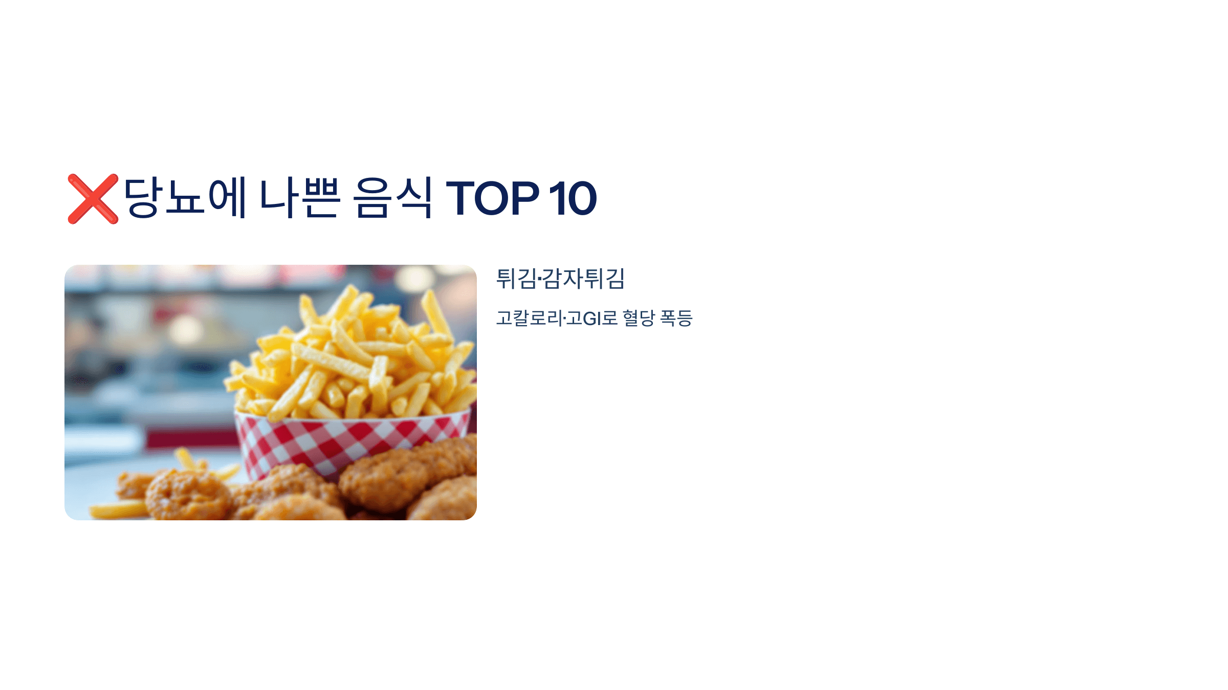 튀긴 음식은 혈당뿐 아니라 트랜스지방과 염분도 문제예요.
