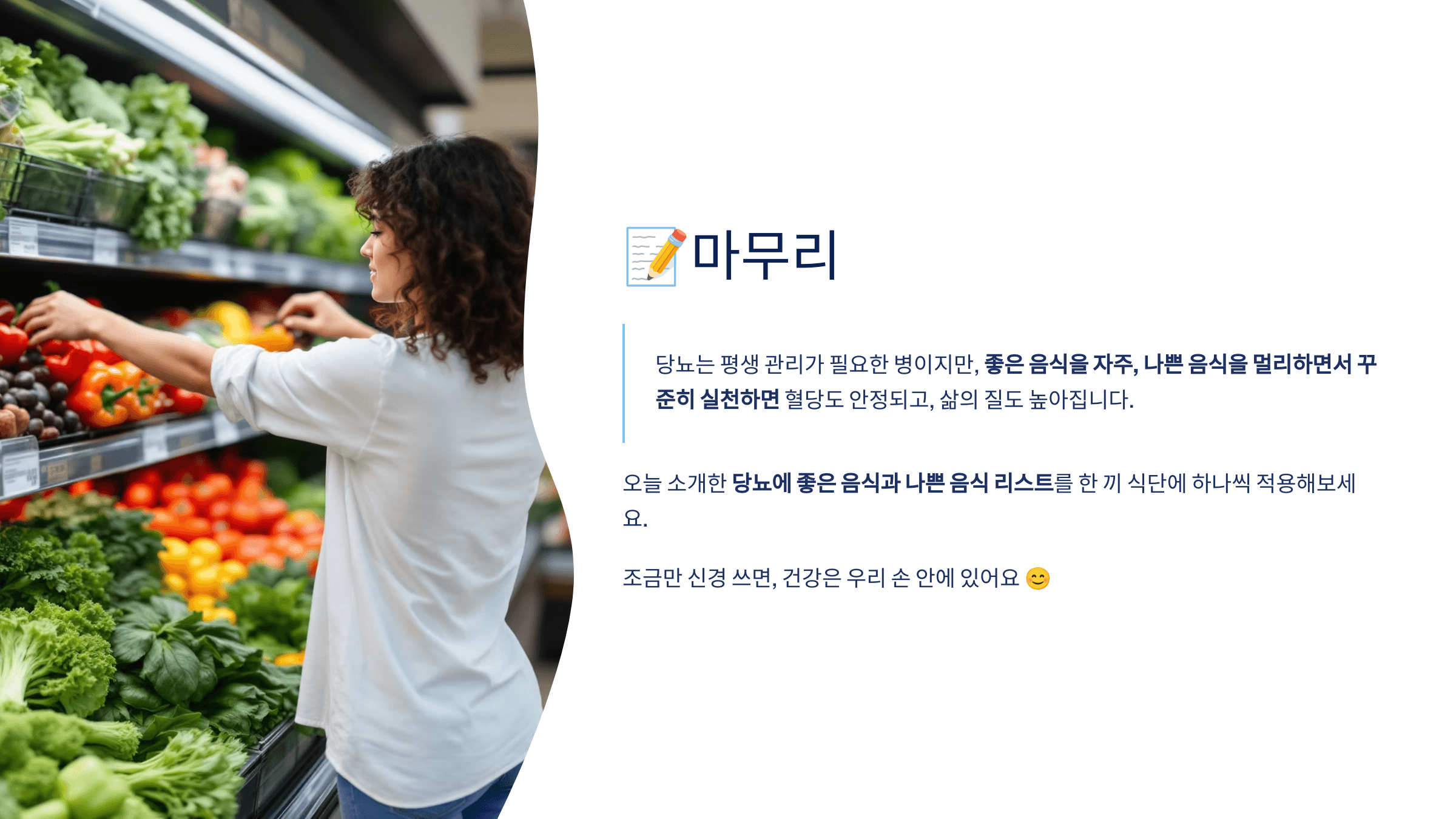 - 발효식품 (김치, 요구르트 등)도 장 건강과 혈당 안정에 도움 됩니다.