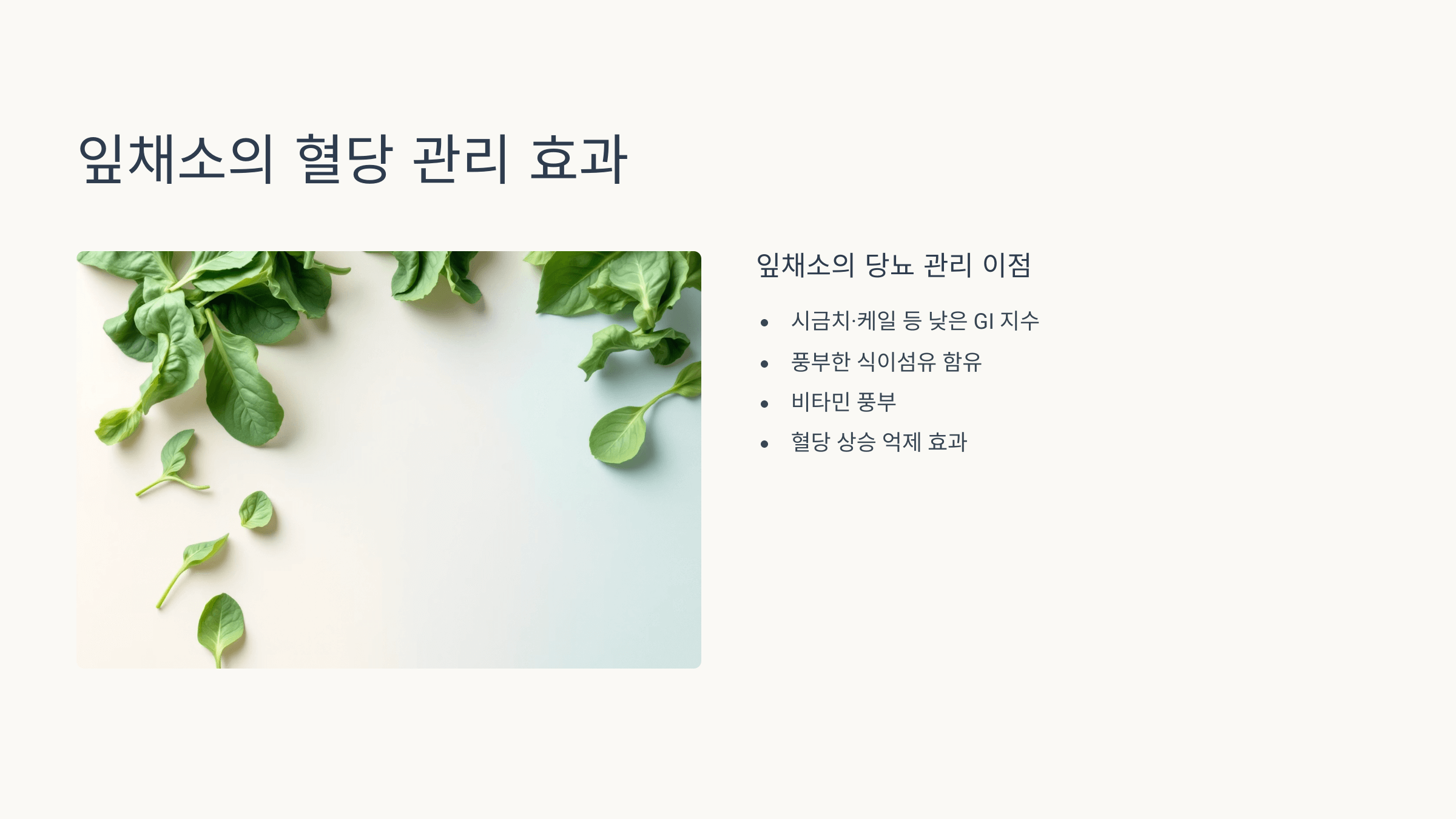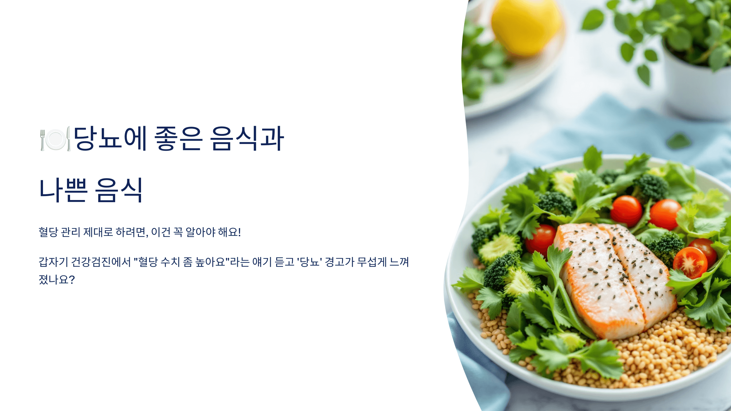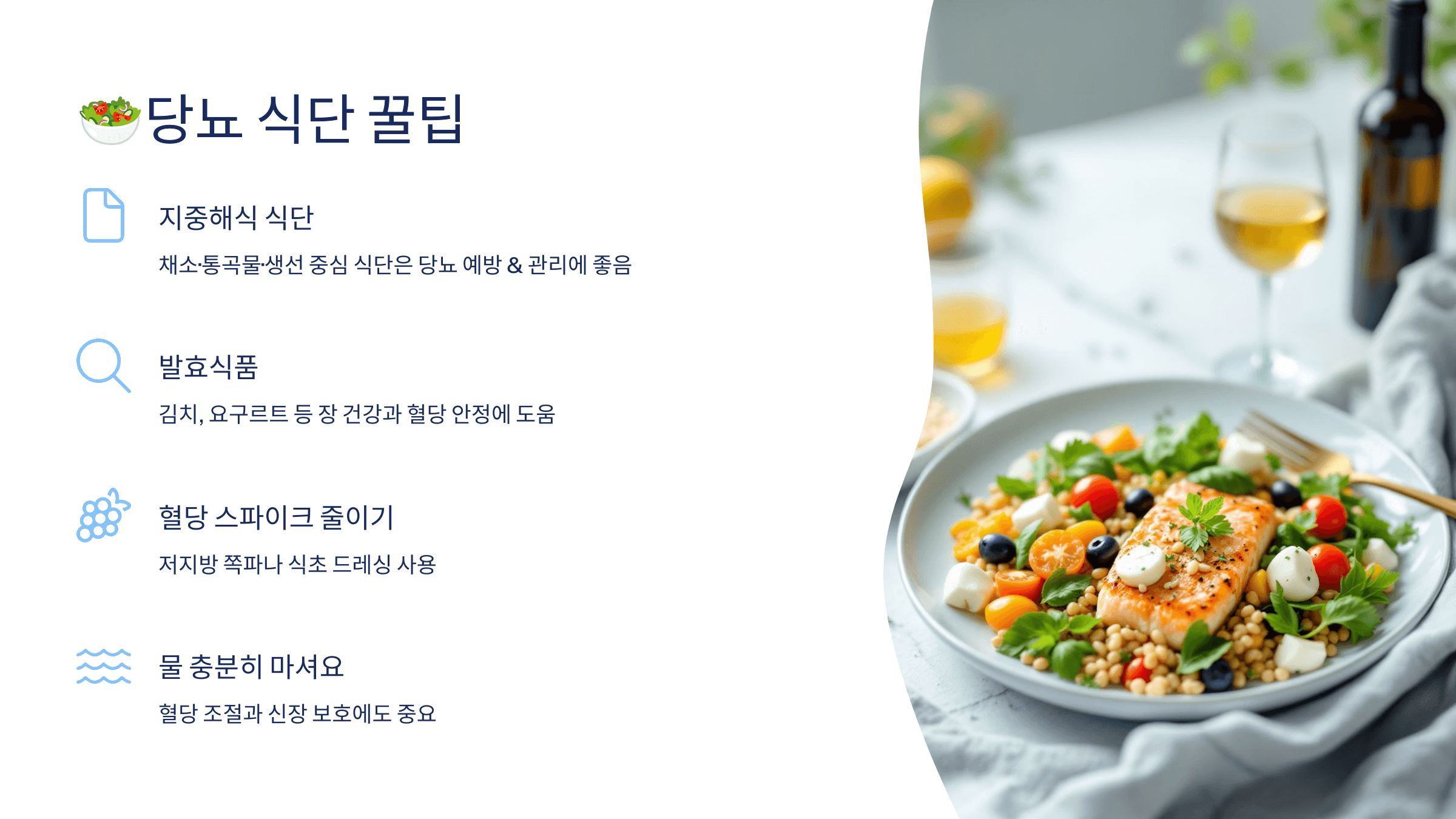 - 지중해식 식단: 채소·통곡물·생선 중심 식단은 당뇨 예방 & 관리에 좋습니다.