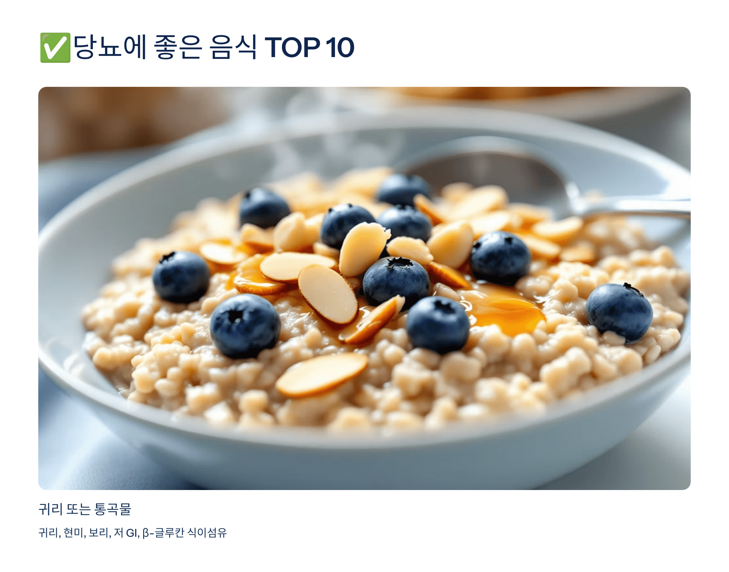 식이섬유와 항산화물질이 풍부해서 혈당 상승을 완만하게 만들어줘요.
