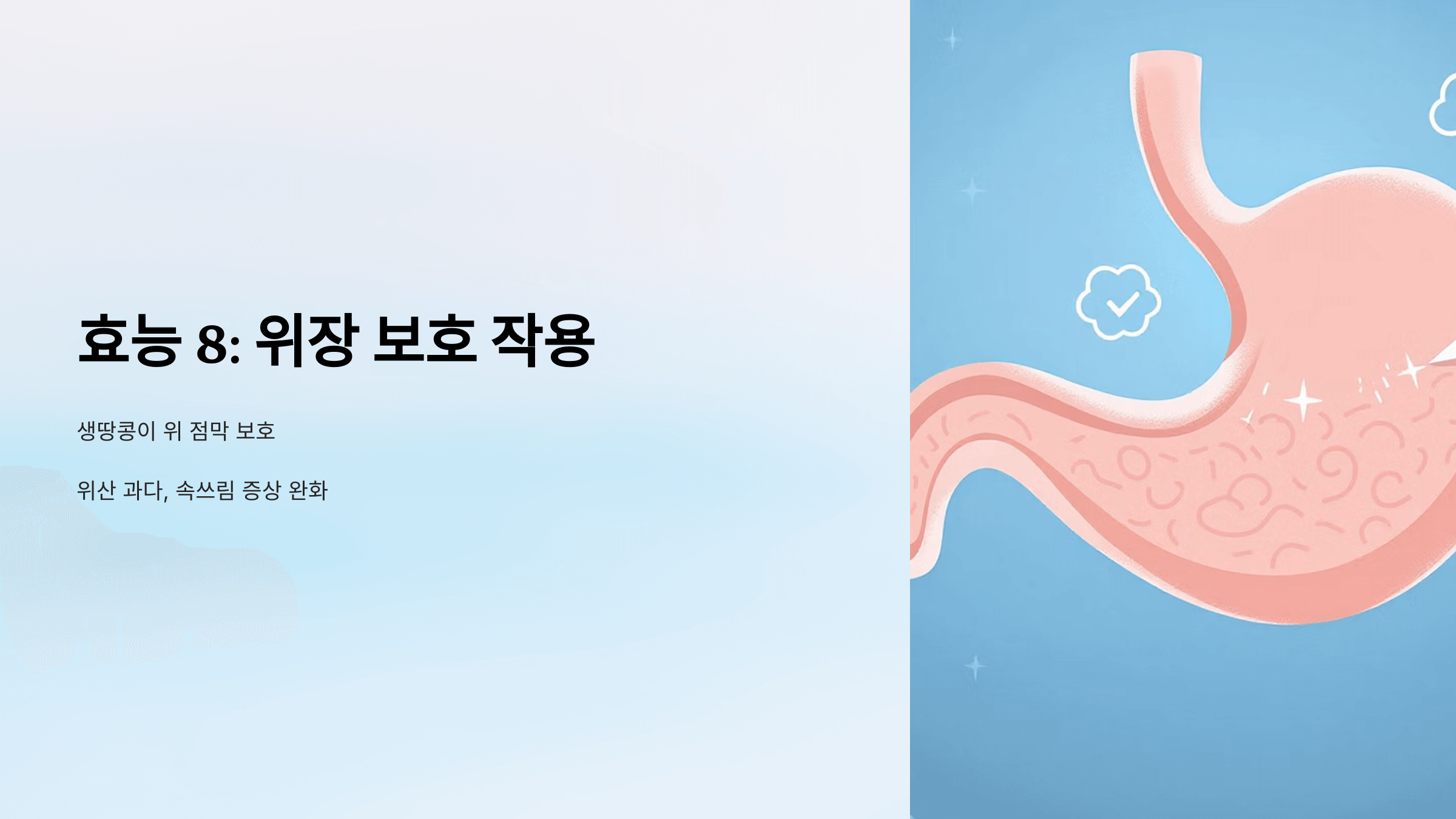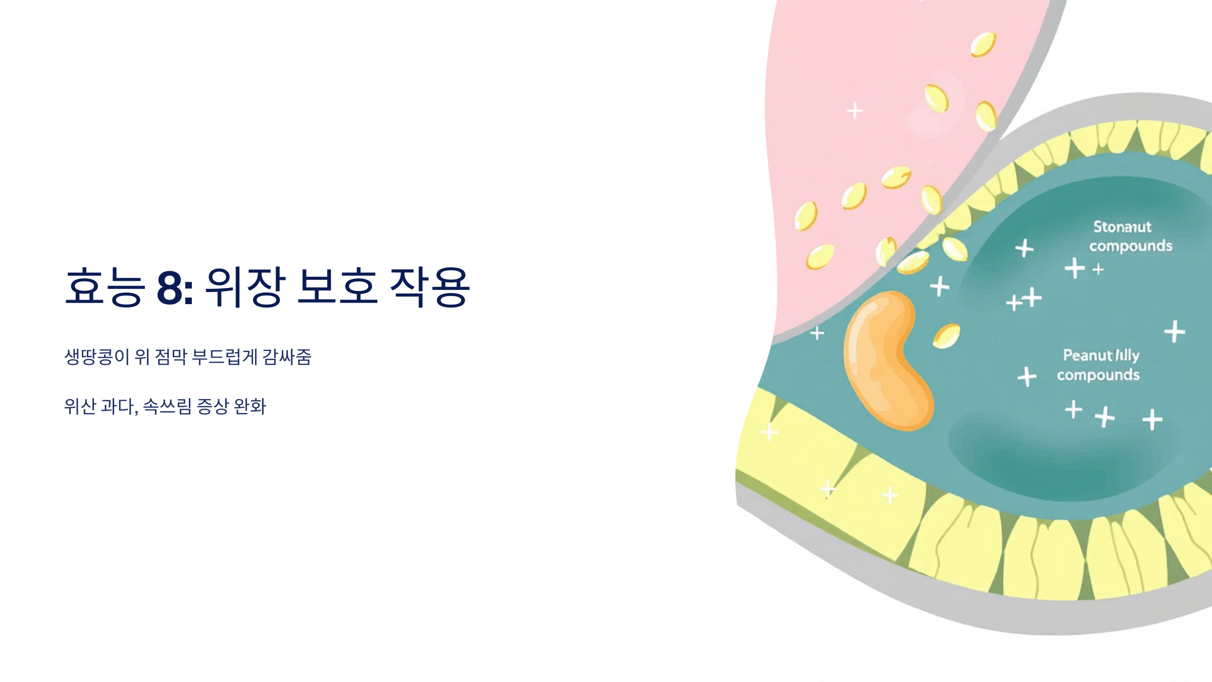 생땅콩의 점액질은 위 점막을 보호하고 속쓰림과 소화불량 개선에 도움을 줍니다. 단, 위가 민감하면 익혀 먹는 것이 좋습니다.