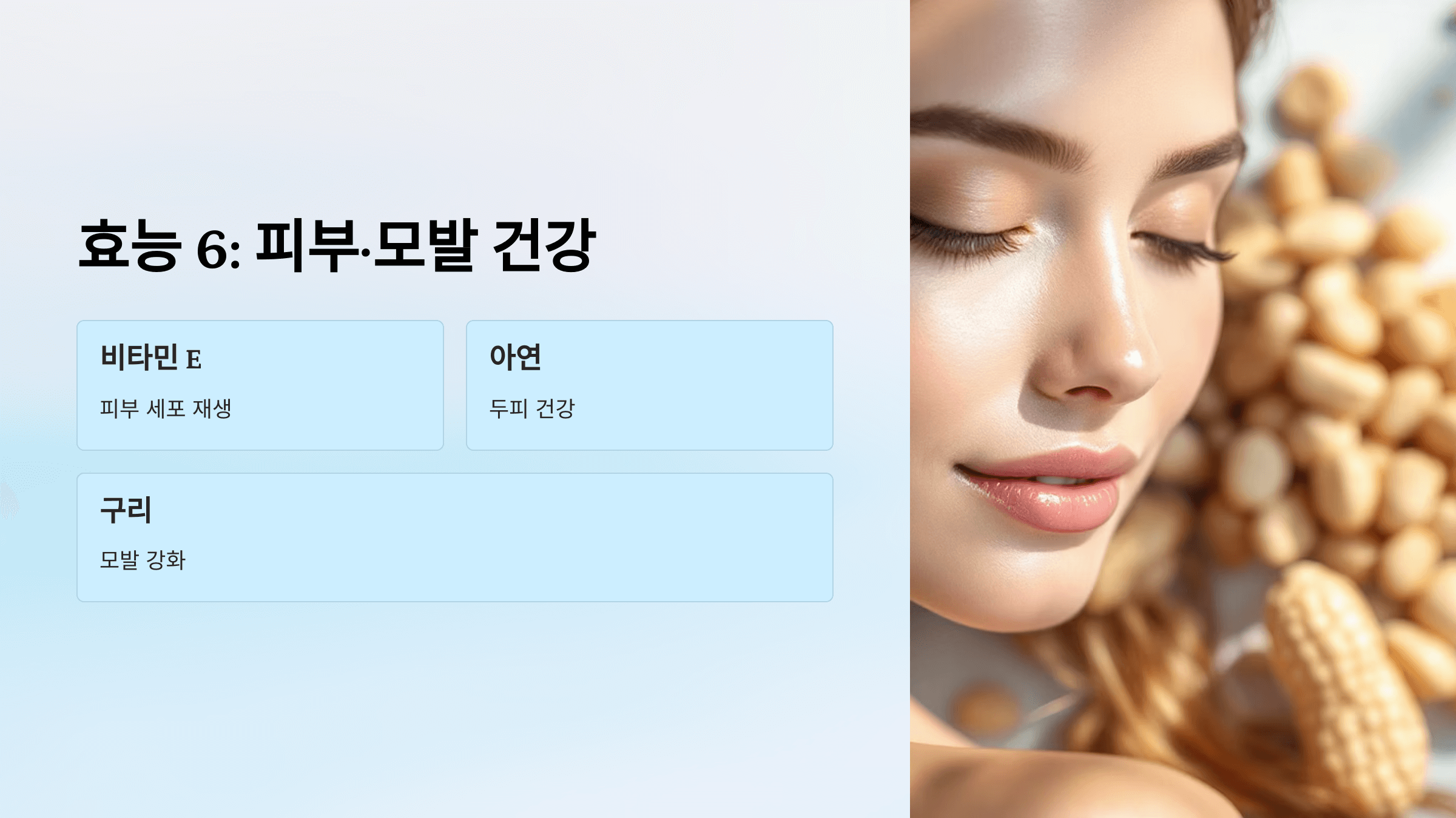비타민 E, 아연, 구리가 함유된 땅콩은 피부 세포 재생과 모발 건강 유지, 즉 땅콩은 뷰티 푸드로도 추천됩니다.