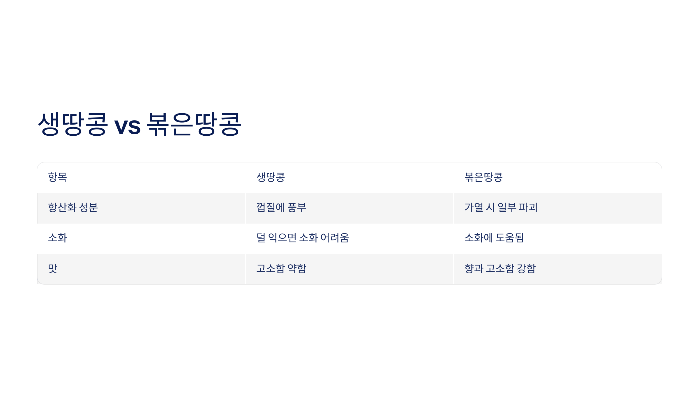 → 생땅콩은 항산화 성분이 더 풍부, 볶은땅콩은 소화와 맛이 개선되어 각각 장단점이 있습니다.