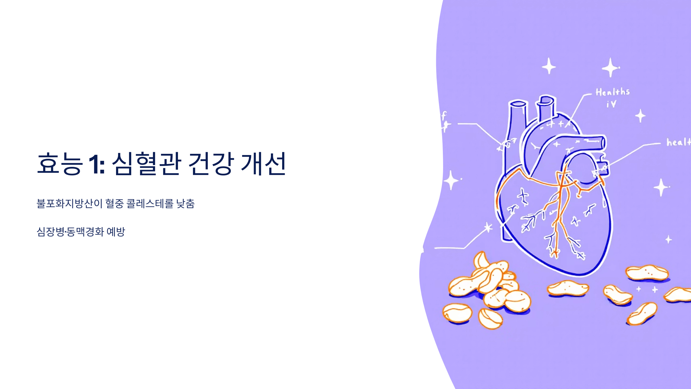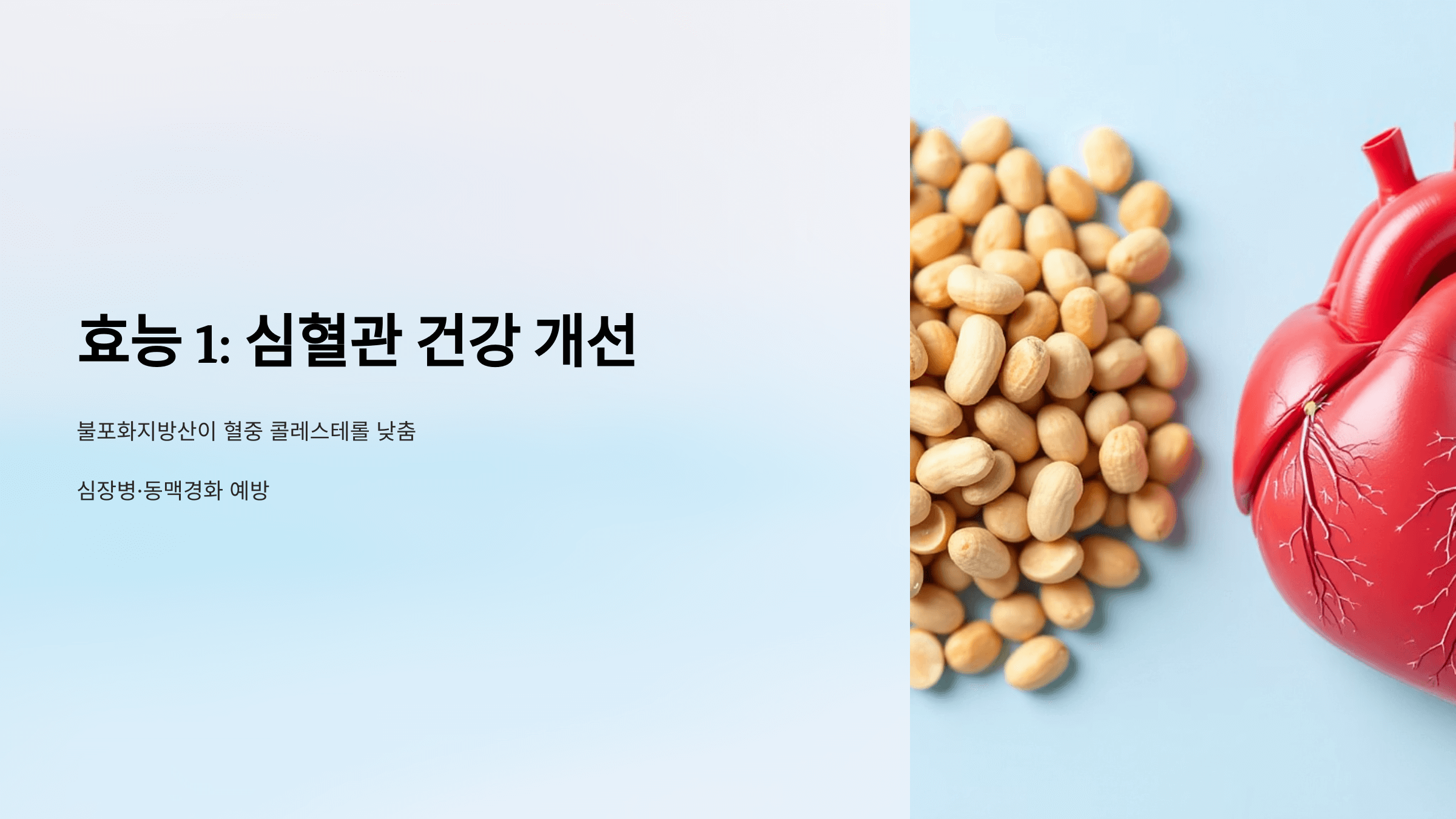 땅콩에 풍부한 불포화지방산(올레산, 리놀레산)은 혈관 내 나쁜 콜레스테롤(LDL)을 줄이고 좋은 콜레스테롤(HDL)을 높여, 땅콩 섭취는 혈관 건강과 심장 보호에 도움이 됩니다.