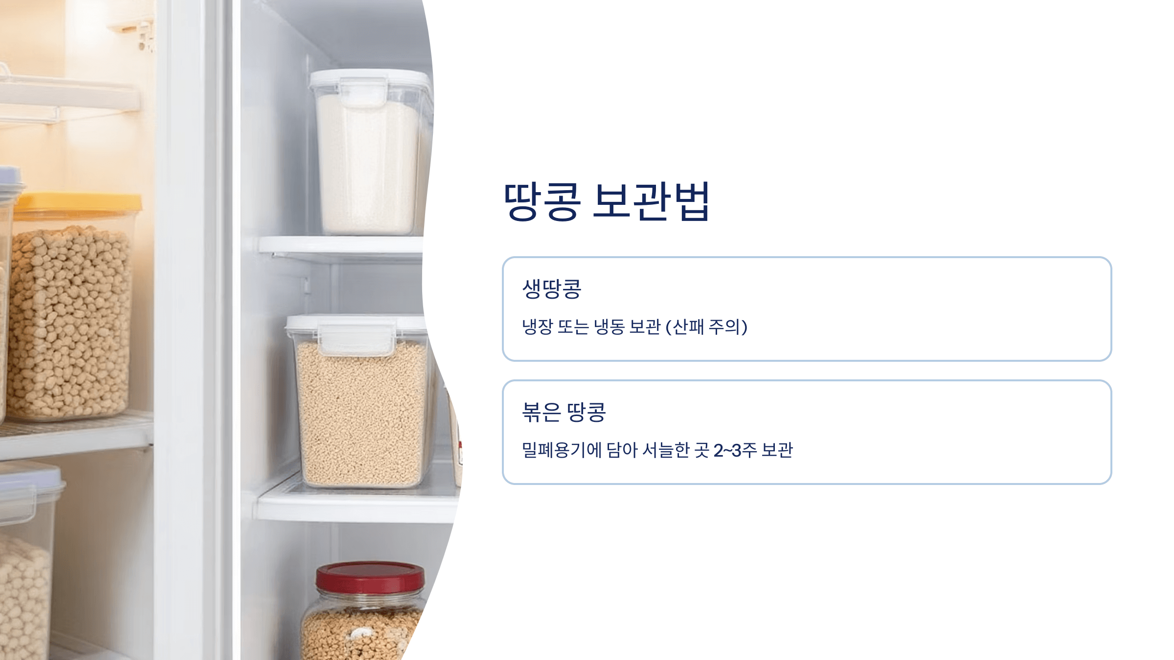 - 볶은 땅콩: 밀폐용기에 담아 서늘한 곳에 2~3주 보관 가능
