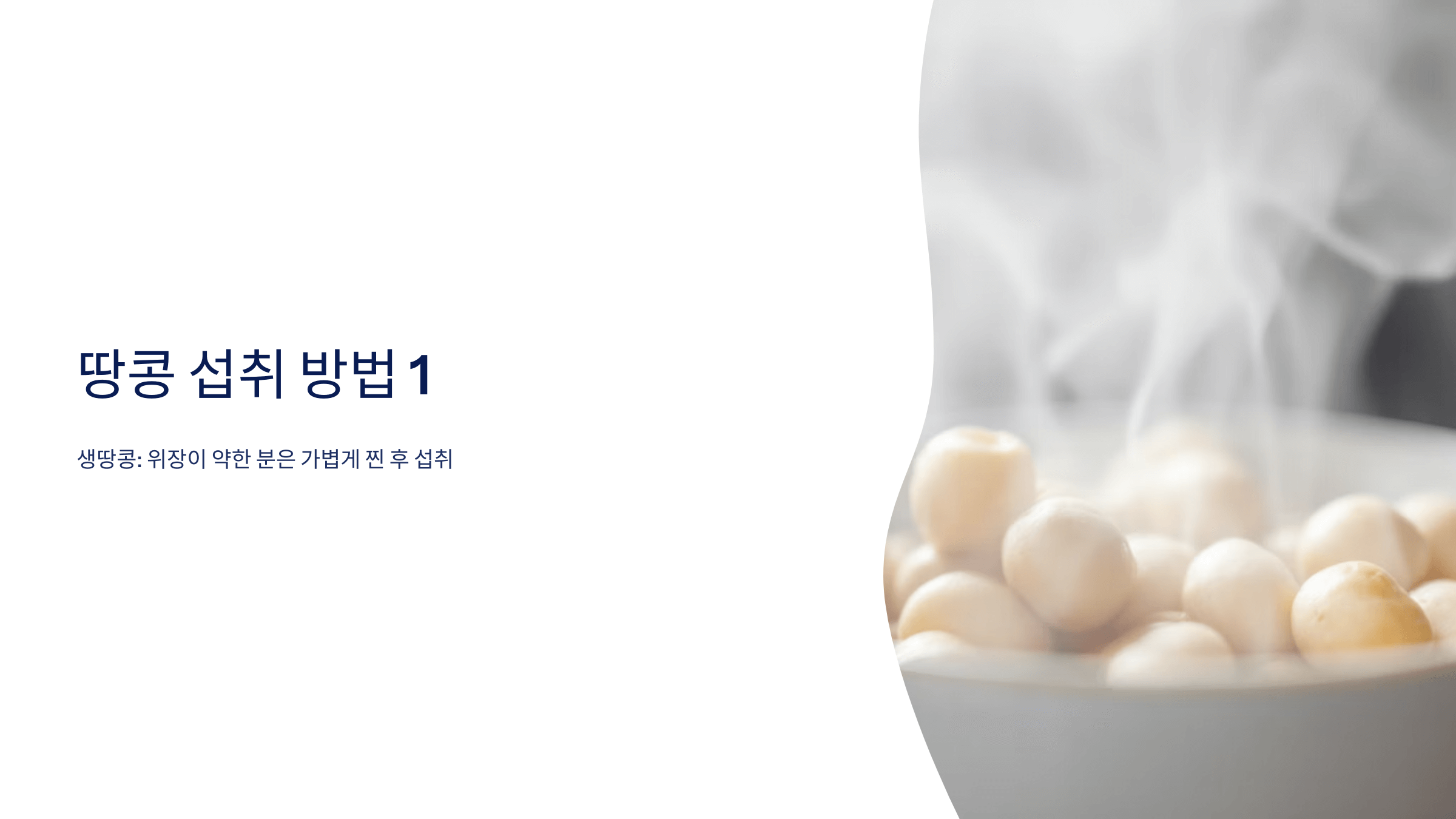 → 공복에는 위장 부담 될 수 있으니 식후나 간식 대용으로 땅콩을 섭취하는 게 좋습니다.