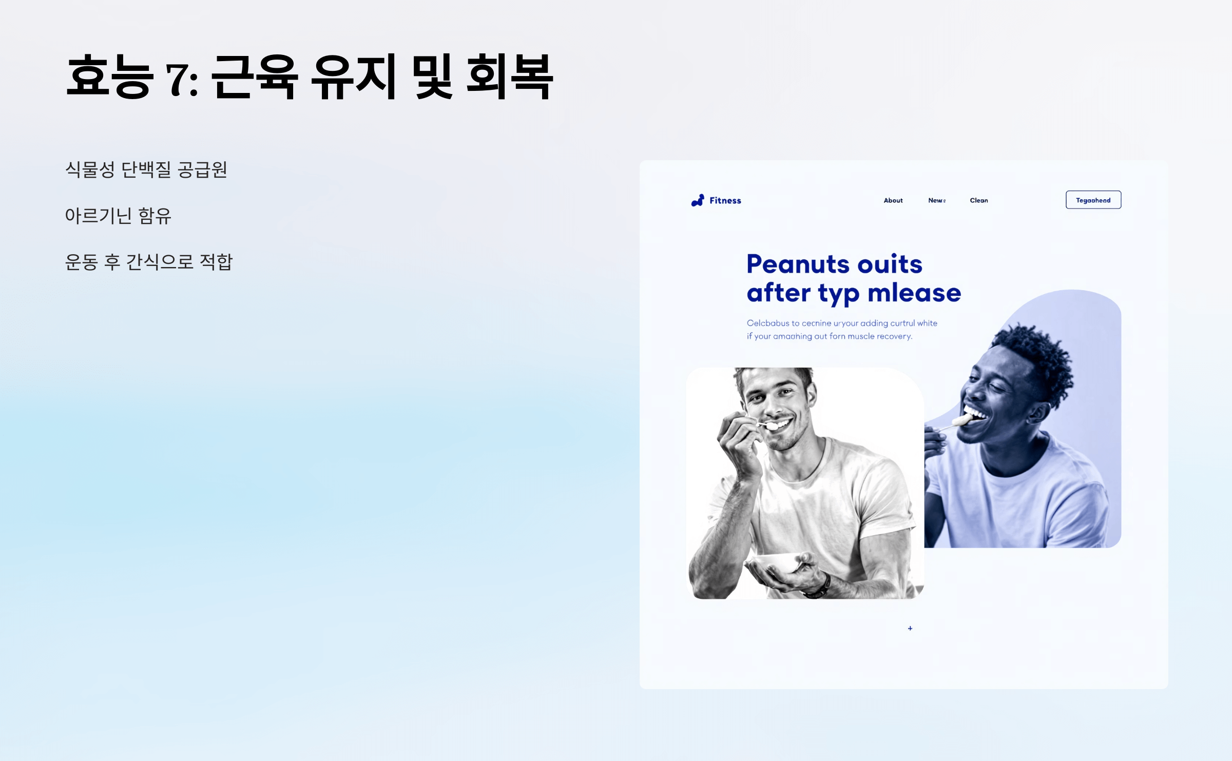 땅콩에 포함된 식물성 단백질과 아르기닌은 근육 성장과 회복에 도움을 주어 운동 후 땅콩 섭취는 회복력 강화에 유리합니다.