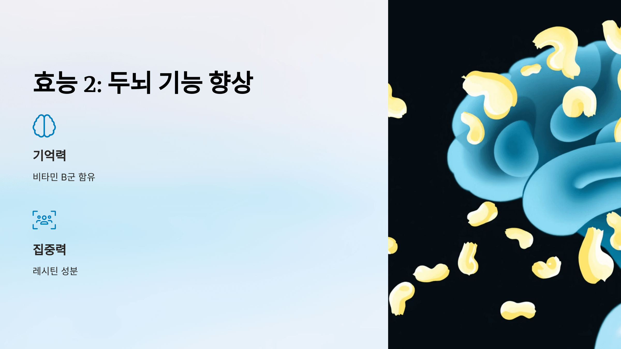 땅콩에는 비타민 B군과 레시틴, 폴리페놀이 다량 들어 있어 기억력, 집중력, 인지 기능 향상에 땅콩 섭취가 두뇌 건강 증진에 유익합니다.