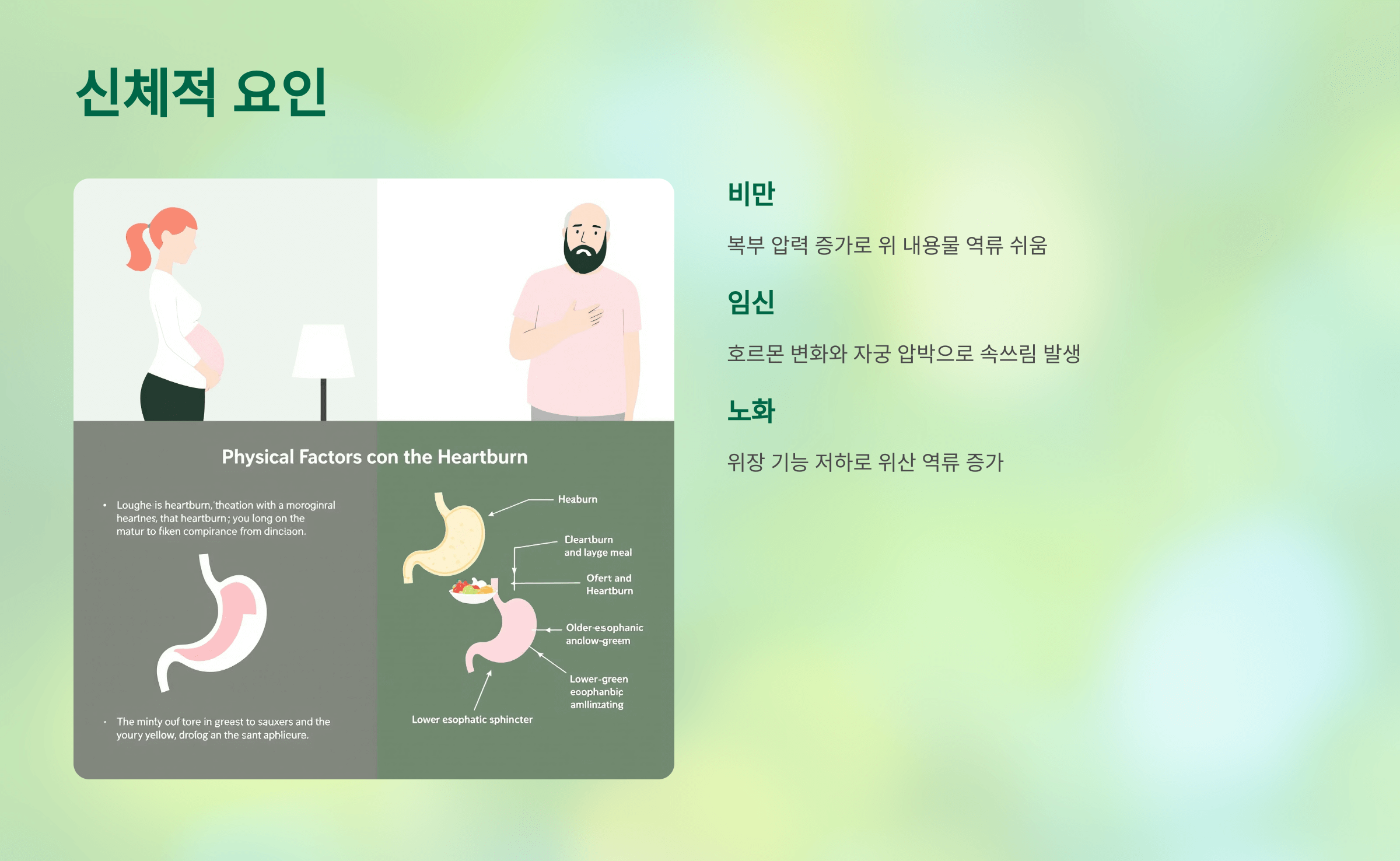 - 임신: 호르몬 변화와 자궁 압박으로 인해 속쓰림이 자주 발생합니다.