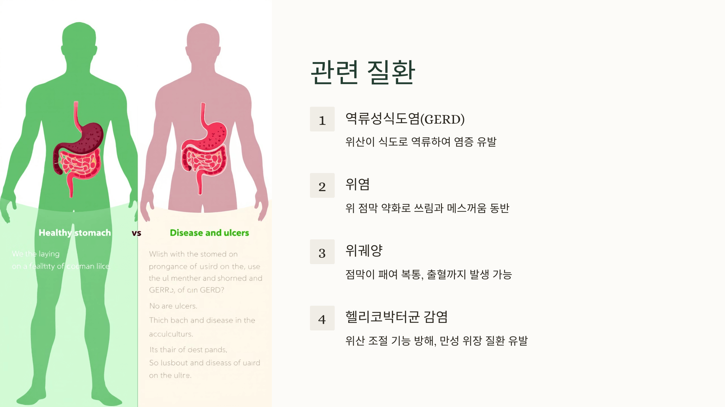 - 헬리코박터균 감염: 위산 조절 기능을 방해하며 만성 위장 질환을 유발합니다.