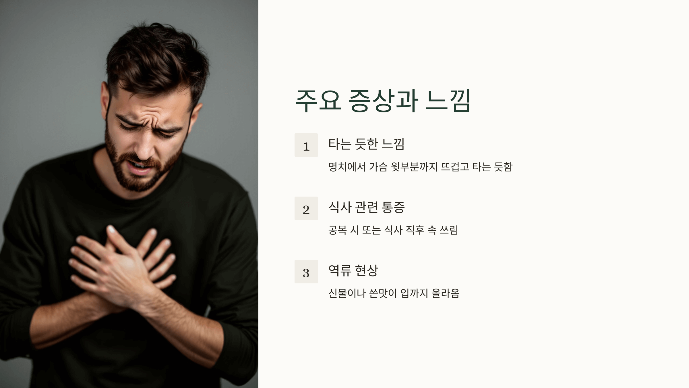 속쓰림이 주된 증상으로, 위산이 식도로 역류하면서 가슴 쓰림, 신물 올라옴, 목 이물감 등이 함께 발생합니다.