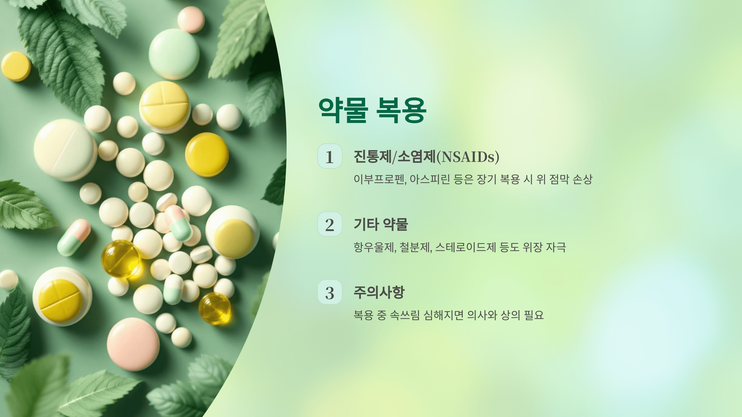 - 항우울제, 철분제, 스테로이드제 등도 위장 자극을 유발할 수 있어요.