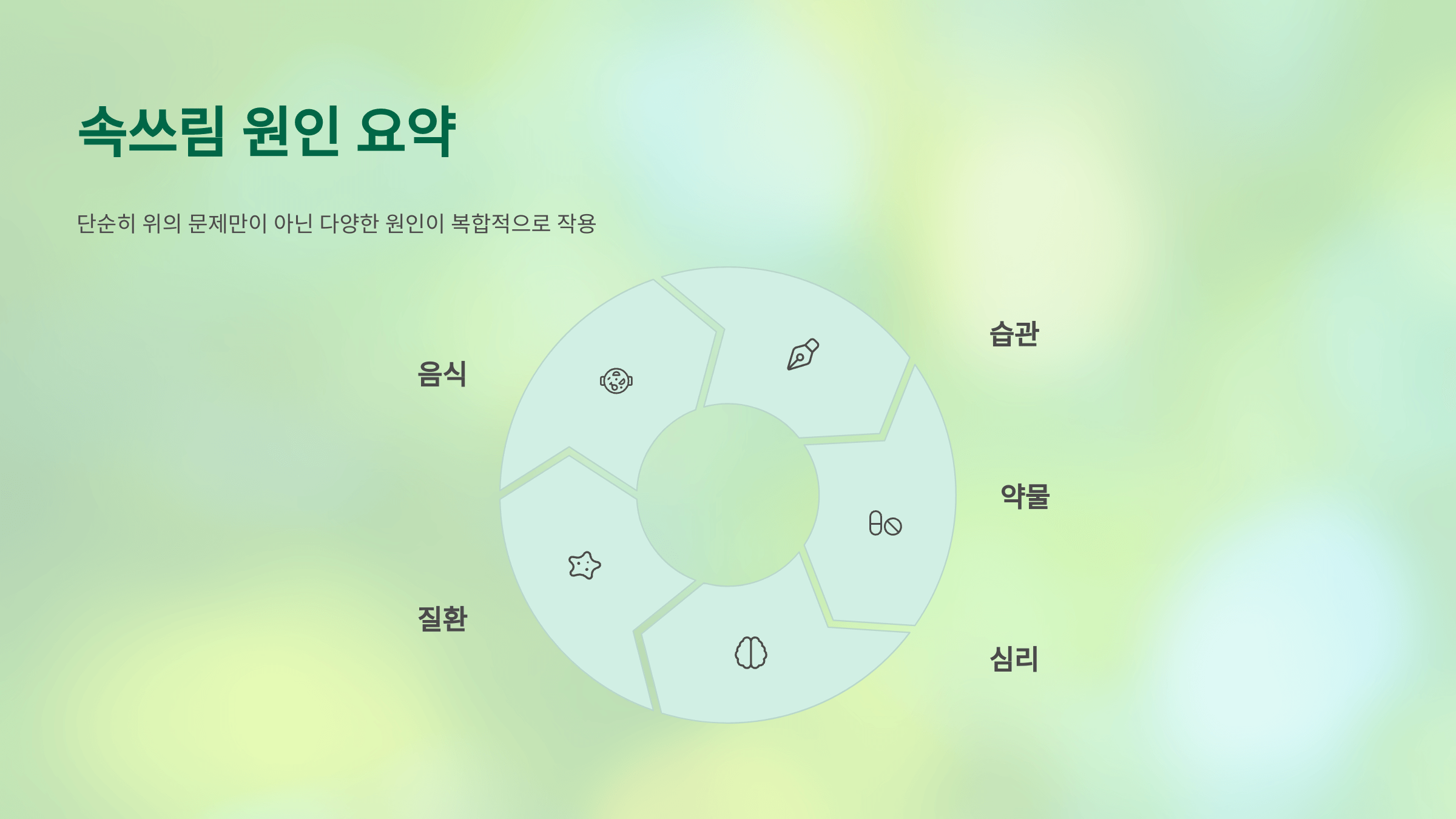 음식, 습관, 약물, 심리, 질환 등 다양한 원인이 복합적으로 작용하는 증상입니다.