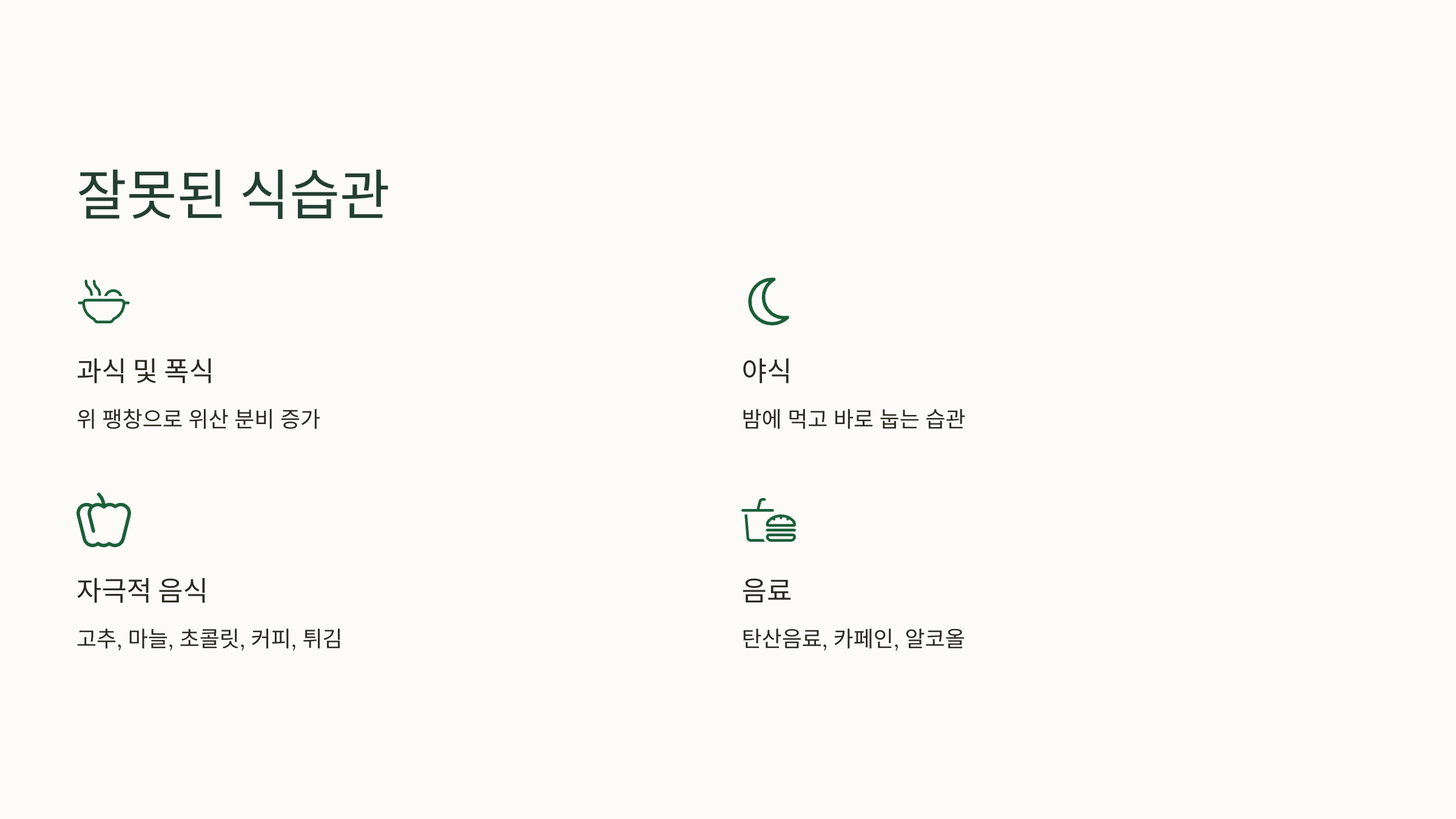 - 야식: 밤늦게 먹고 바로 눕는 습관은 위산이 식도로 쉽게 역류하게 만듭니다.