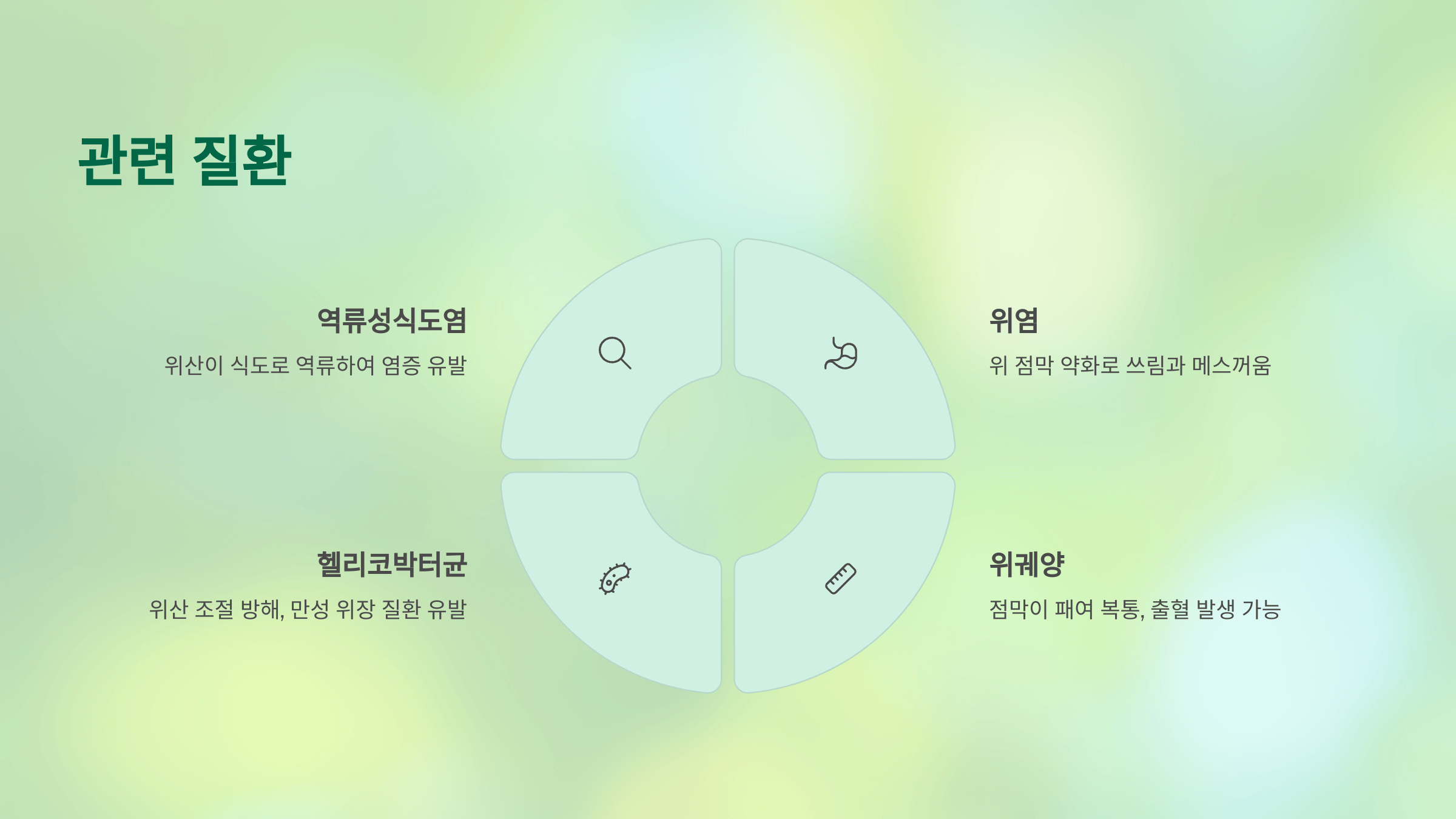 - 역류성식도염(GERD): 위산이 식도로 역류하면서 식도에 염증을 유발해요. 속쓰림이 대표 증상입니다.