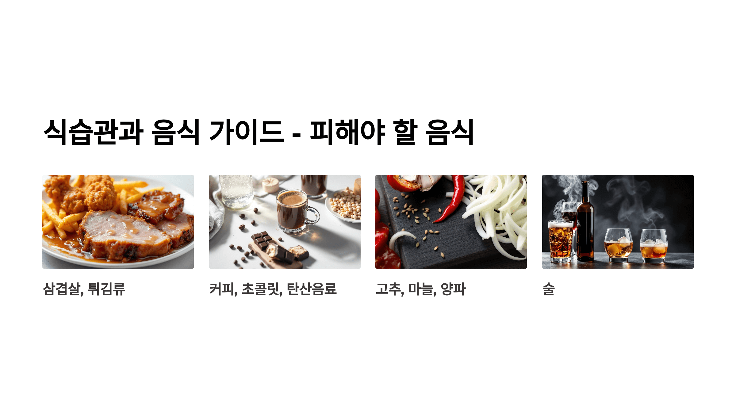 기름진 음식(삼겹살, 튀김), 커피, 초콜릿, 탄산음료, 술, 고추, 마늘, 양파 등은 역류성식도염 증상을 심하게 만들 수 있어요.