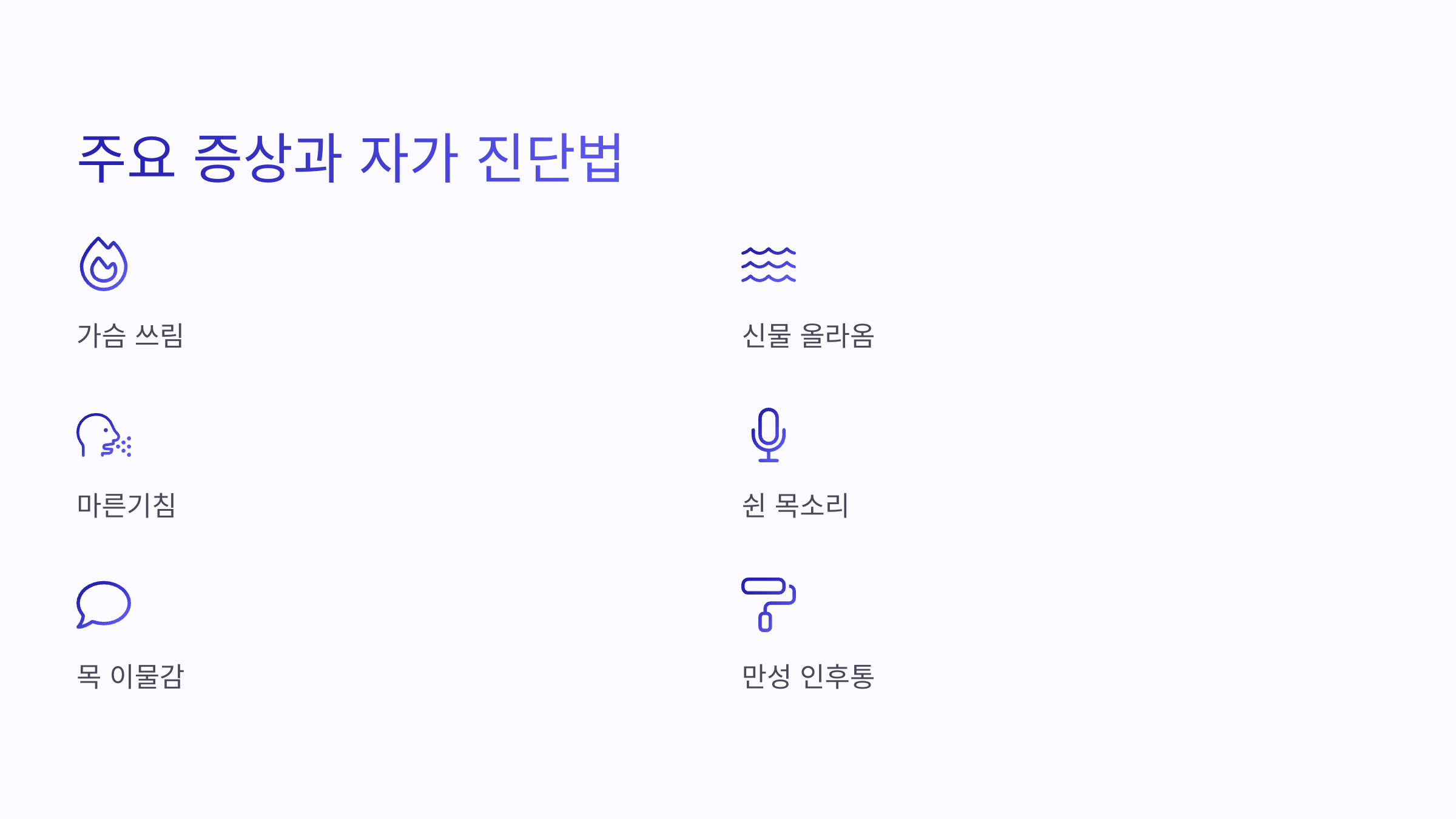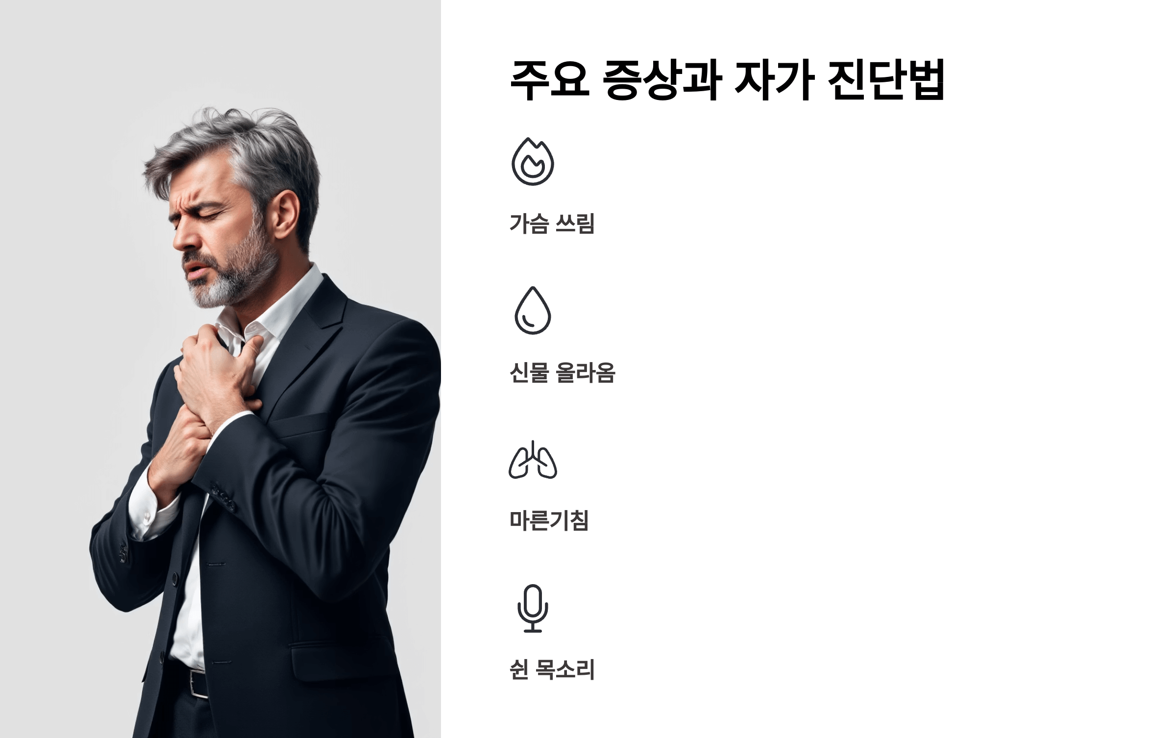 대표 증상은 가슴 쓰림과 신물 올라옴인데, 그 외에도 마른기침, 쉰 목소리, 목 이물감, 만성 인후통 등이 동반될 수 있어요.