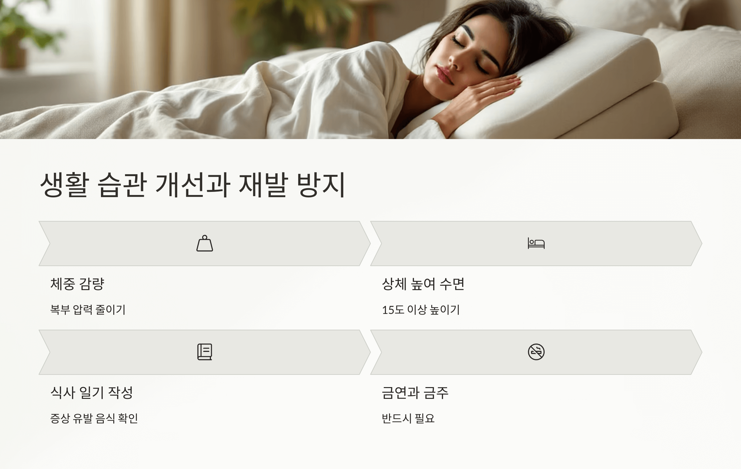 생활습관 개선 없이 약만 복용할 경우 재발률이 매우 높습니다. 특히 역류성식도염은 습관병이라고 불릴 만큼 일상 관리가 중요해요.