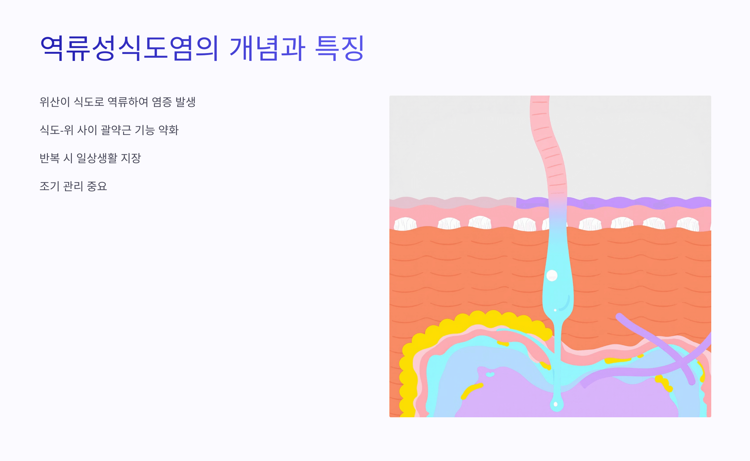 역류성식도염은 위산이 식도로 역류하면서 식도 점막에 염증이 생기는 소화기 질환이에요.