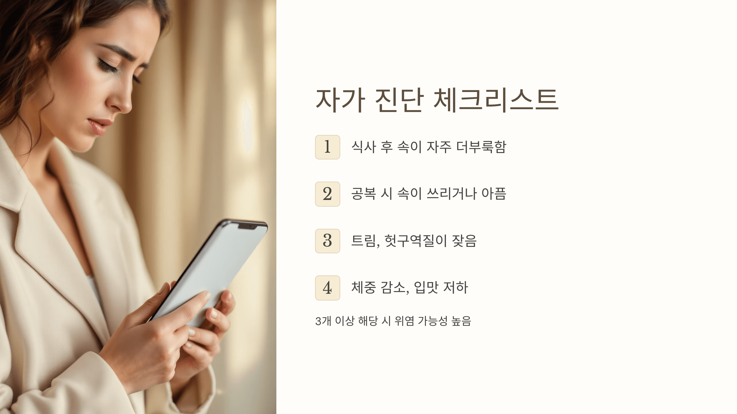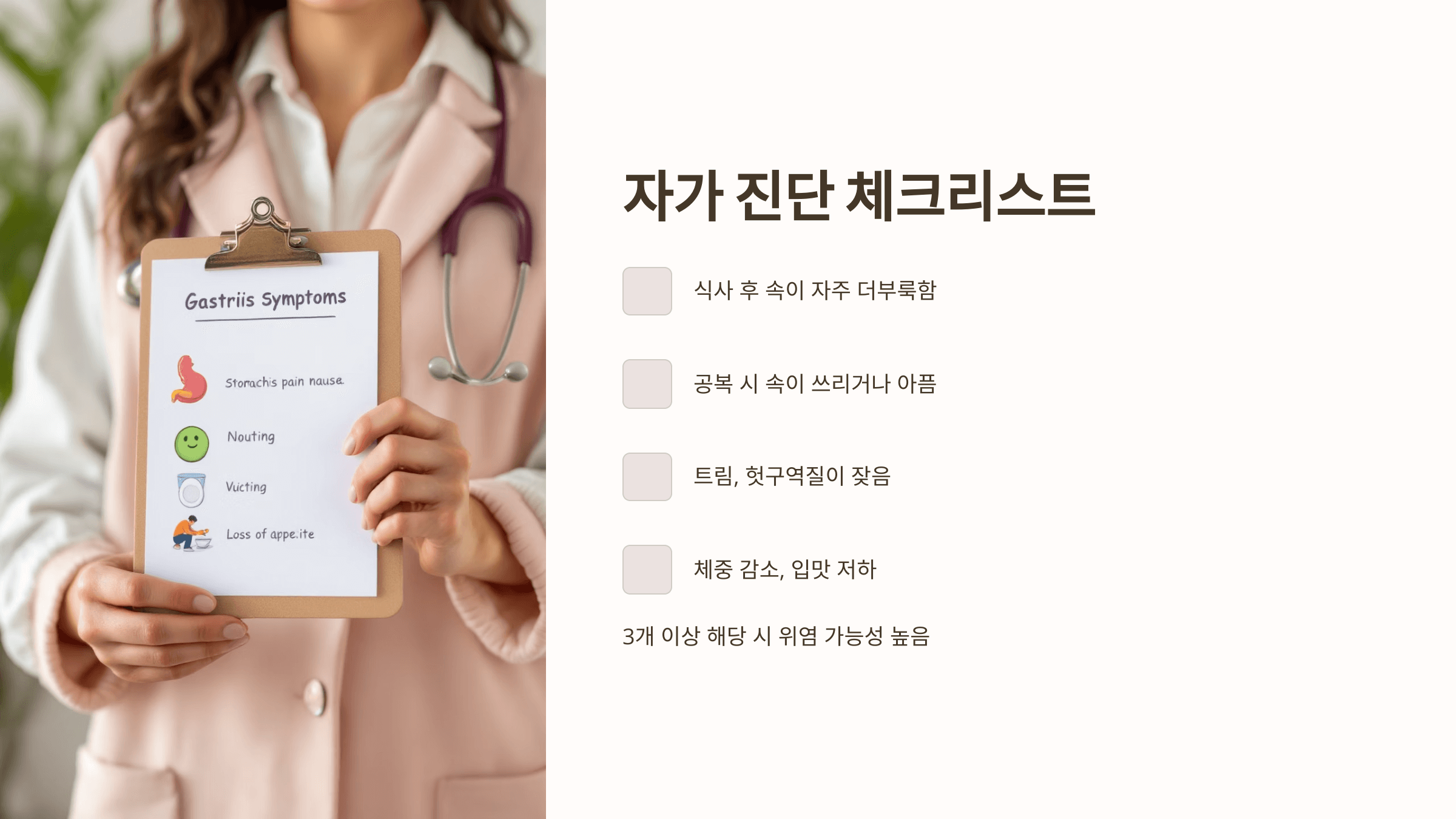 ➡️ 3개 이상 해당된다면 위염 가능성이 높습니다.