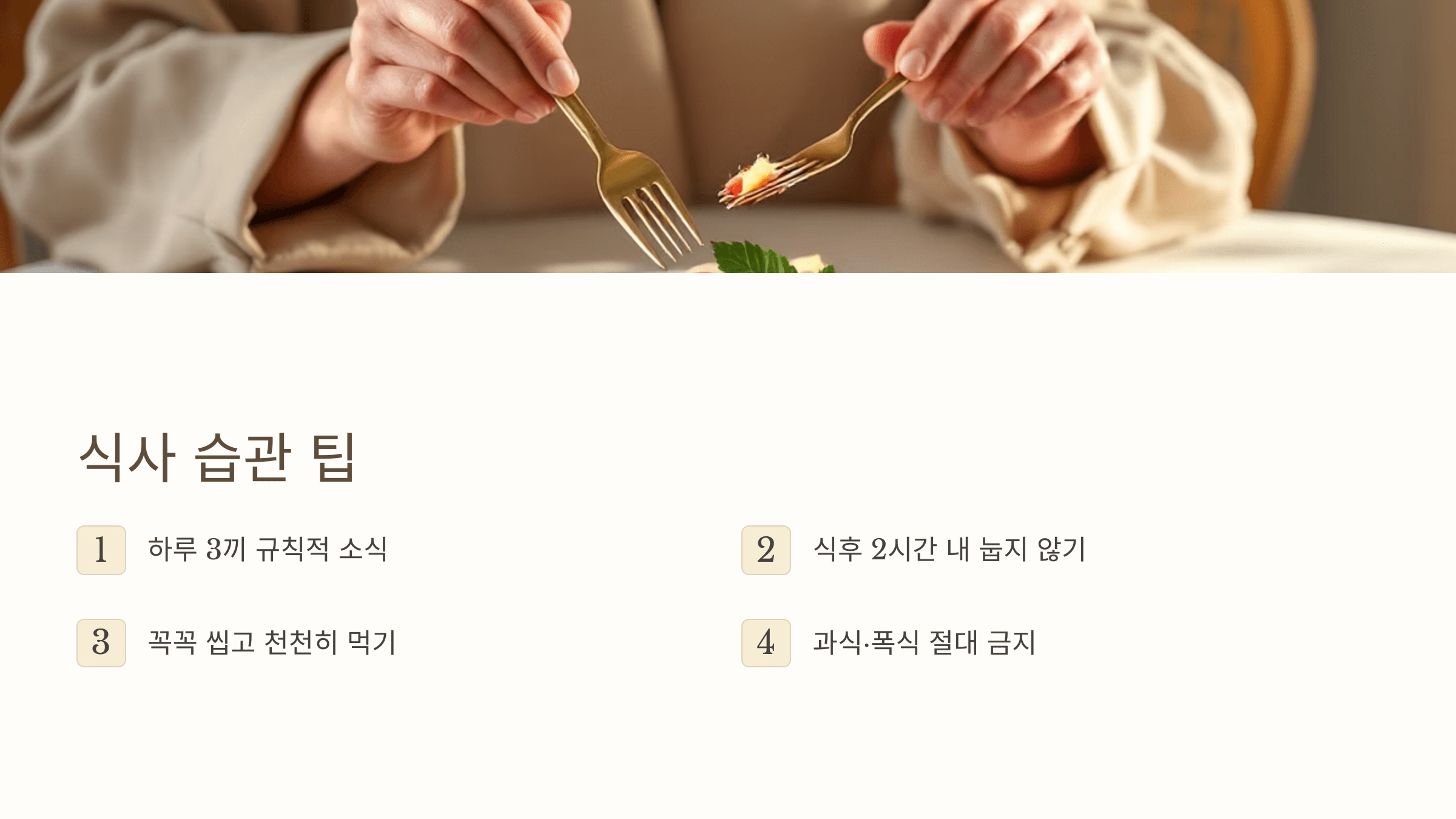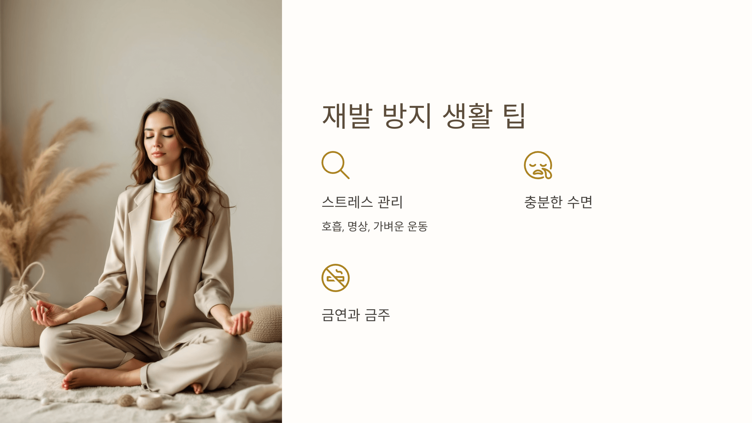 - 스트레스 줄이기: 깊은 호흡, 명상, 가벼운 운동 활용