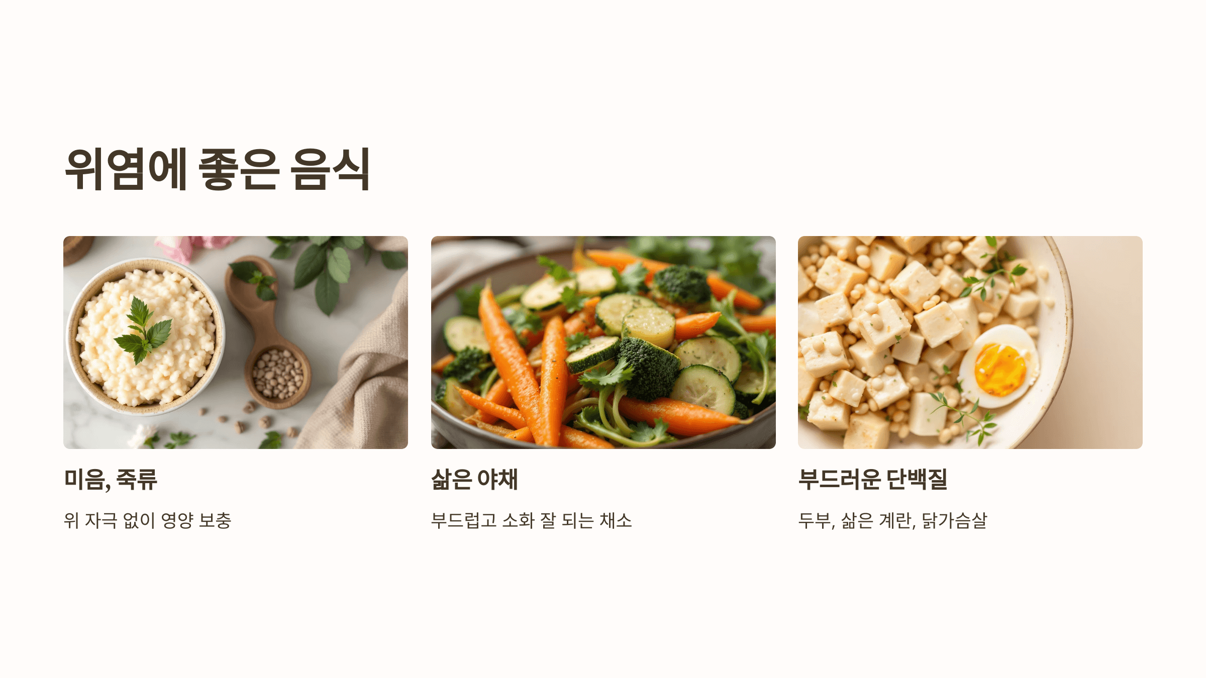 미음, 죽, 바나나, 삶은 감자, 두부 등 부드럽고 자극 없는 음식이 위염 관리에 효과적입니다.
