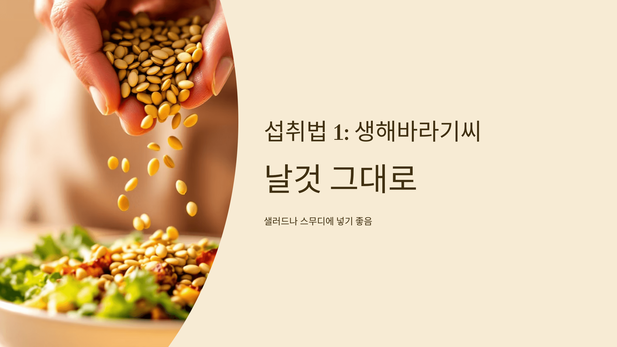 - 생해바라기씨: 날것으로 샐러드나 스무디에 넣기 좋아요.