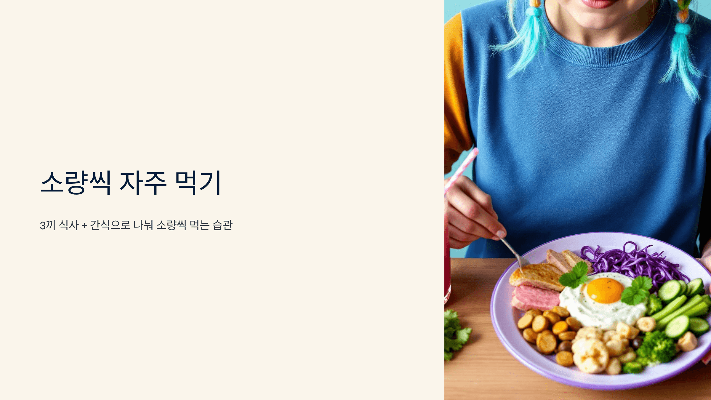 3끼 식사 + 간식으로 나눠 소량씩 먹는 습관이 중요합니다.