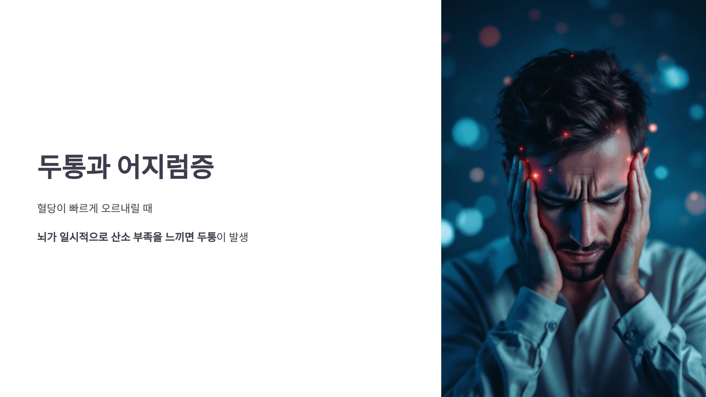 혈당이 빠르게 오르내릴 때 뇌가 일시적으로 산소 부족을 느끼면 두통이 올 수 있어요.