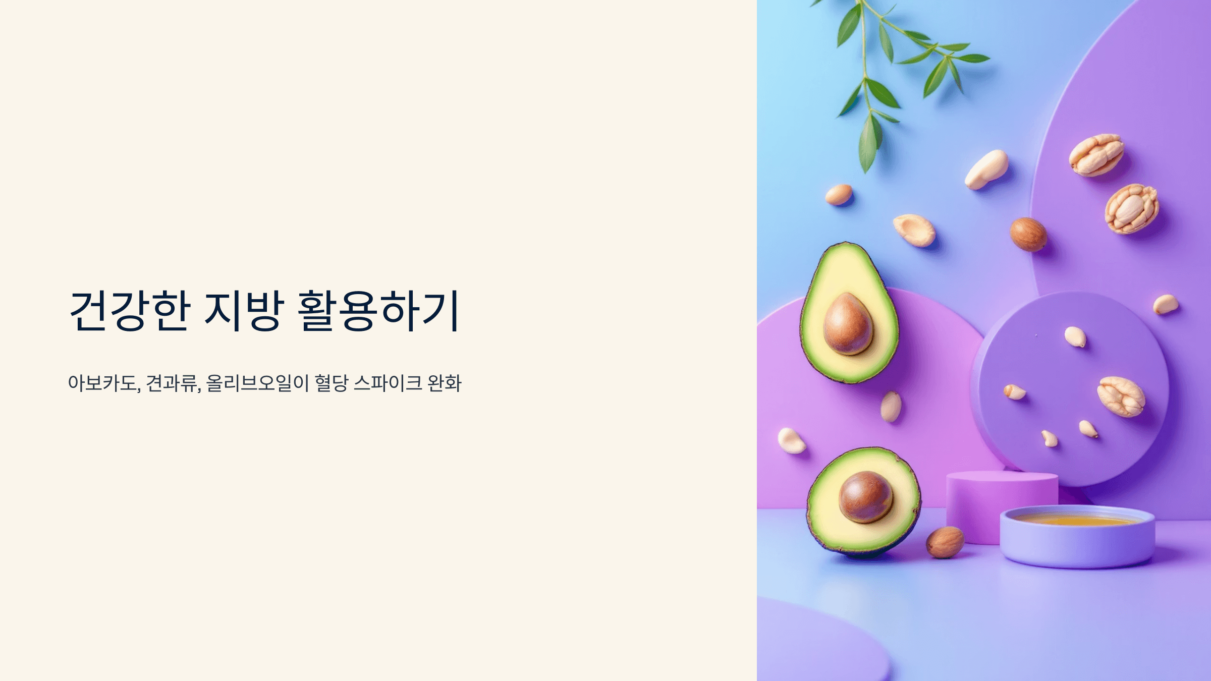 아보카도, 견과류, 올리브오일 등은 혈당 스파이크 완화에 도움을 줍니다.