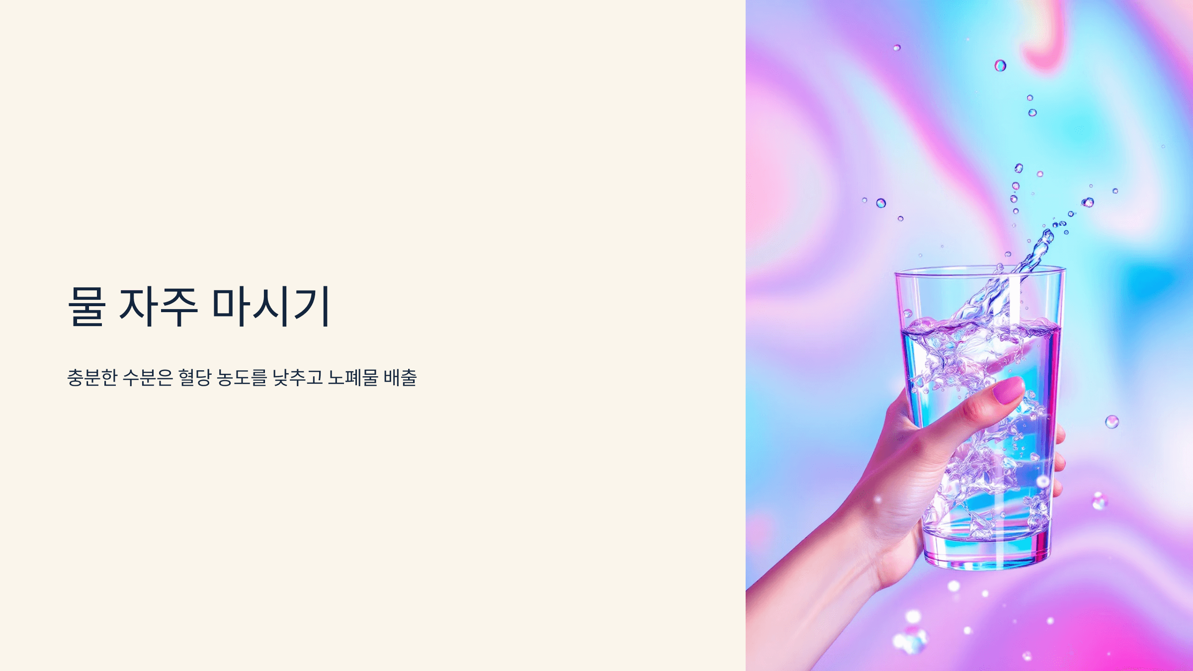 충분한 수분은 혈당 농도를 낮추고 노폐물 배출에도 도움이 돼요.