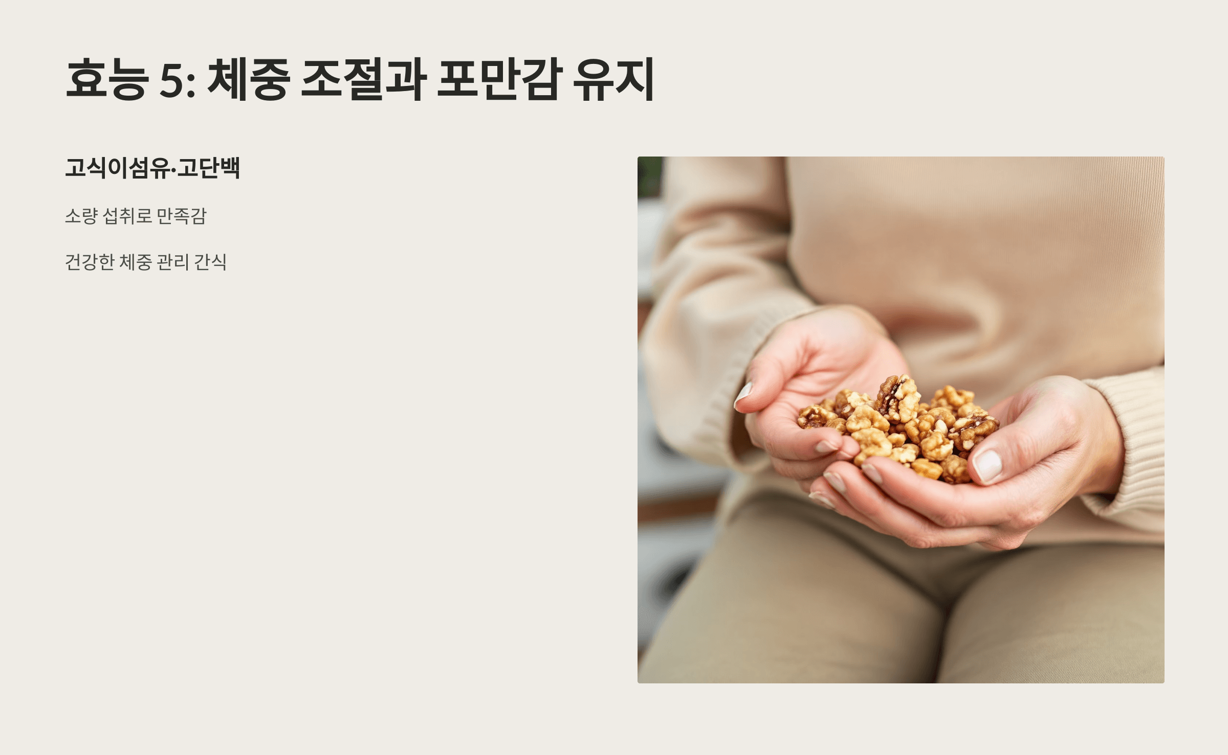 호두는 고식이섬유·고단백 식품으로 소량 섭취만으로도 만족감을 주어 건강한 체중 관리 간식으로 적합합니다.