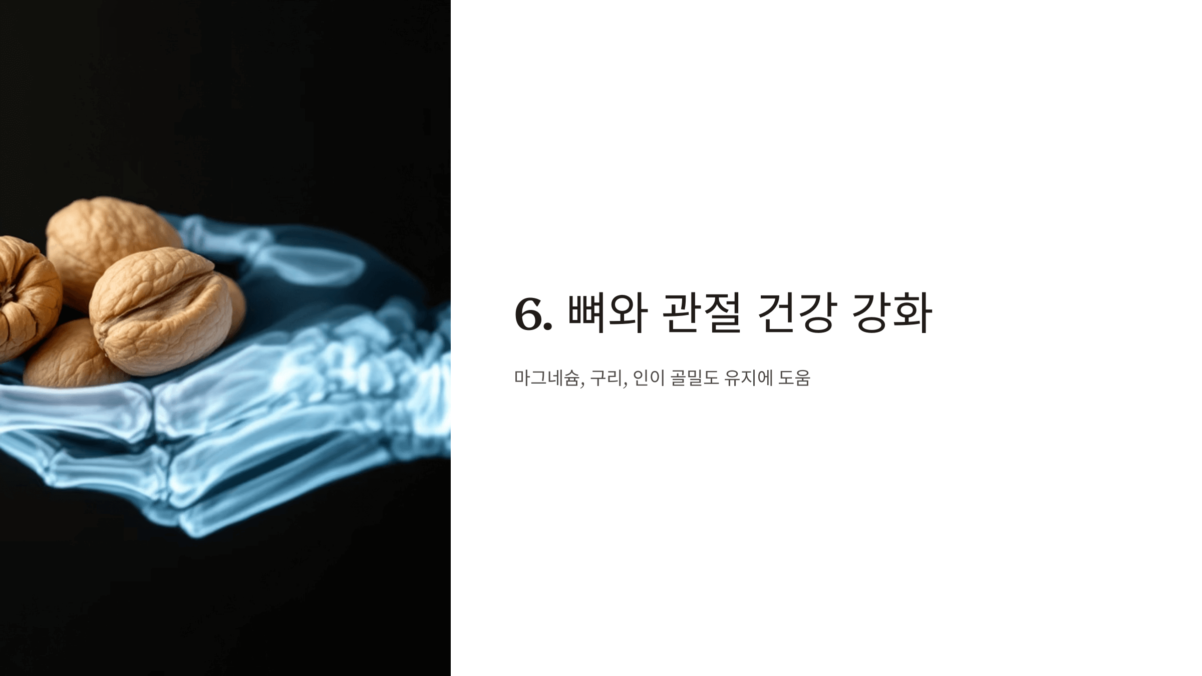 호두에 포함된 마그네슘, 구리, 인 등 미네랄은 뼈와 관절을 튼튼하게 해주고 골밀도 유지에 좋습니다.