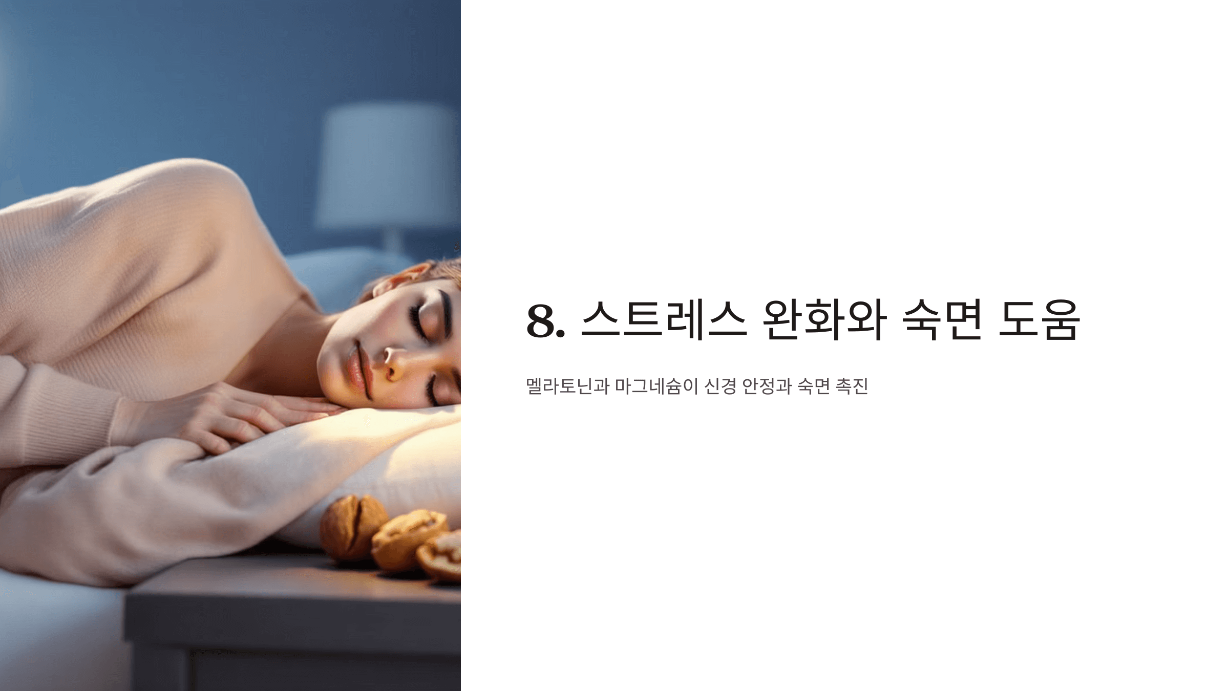 호두에는 멜라토닌과 마그네슘이 포함되어 있어 신경 안정과 근육 이완을 도와 숙면과 스트레스 해소에 좋습니다.