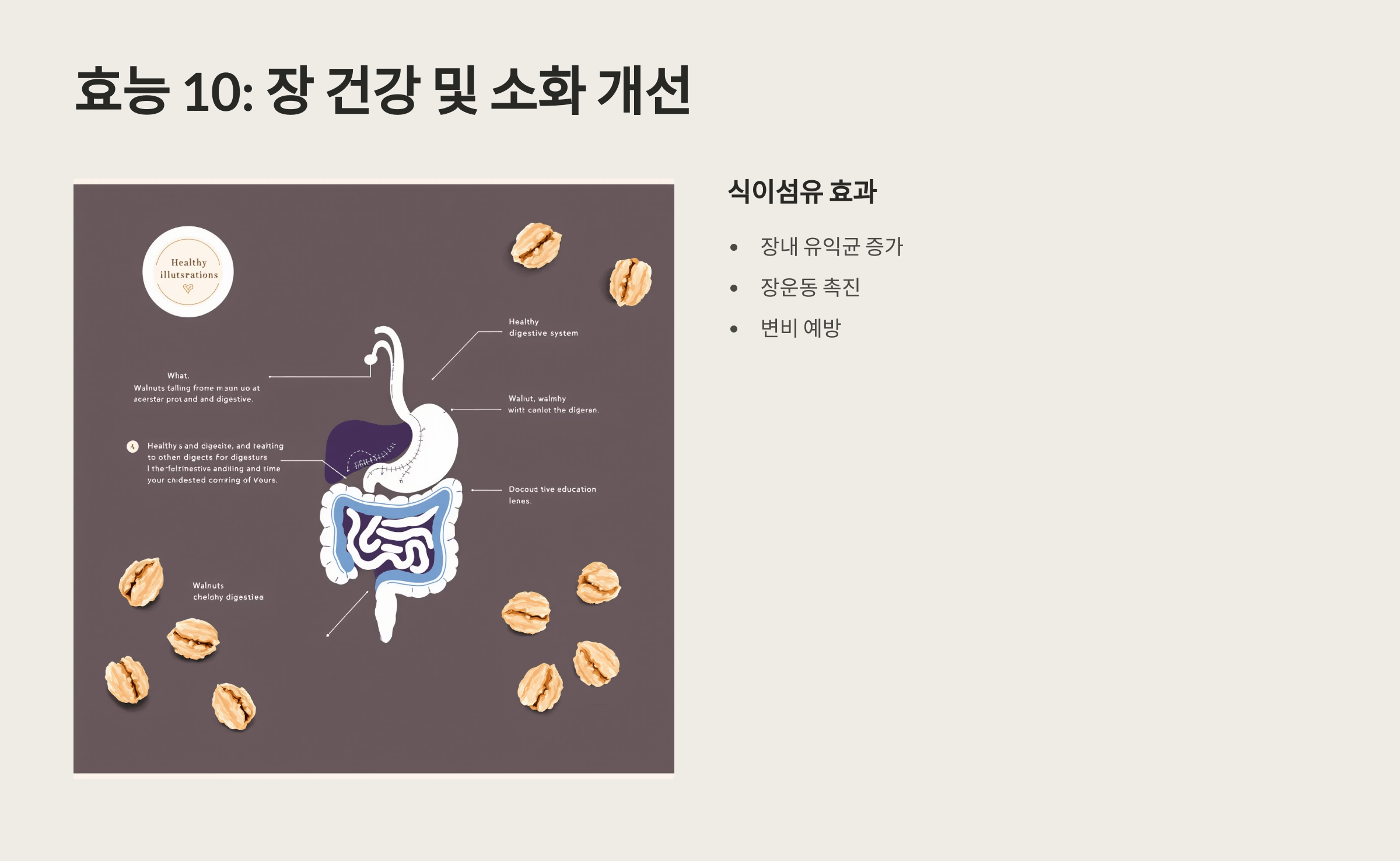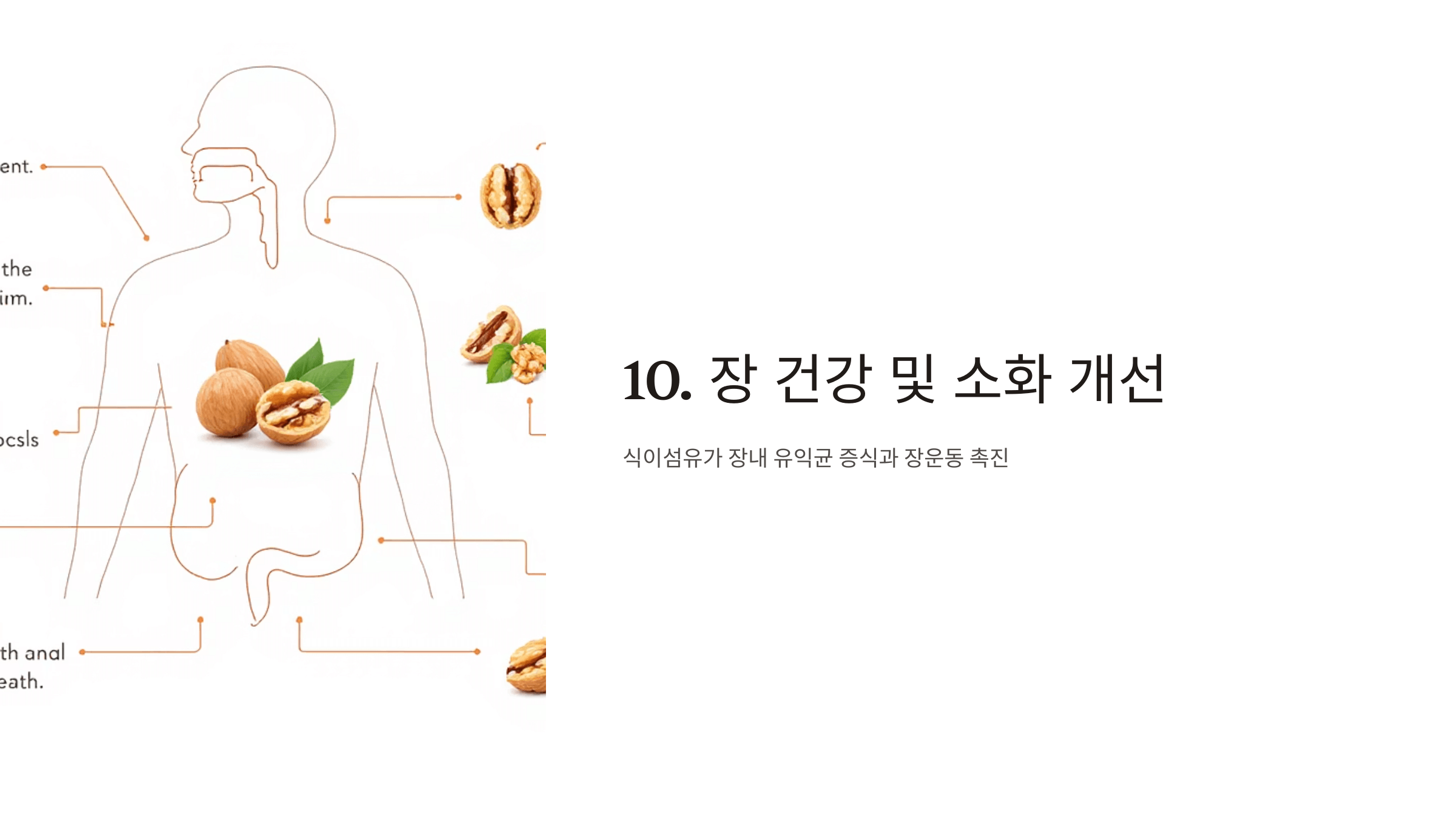 호두의 식이섬유는 장내 유익균을 키우고 장운동을 촉진해 변비 예방과 장 건강에 기여합니다.