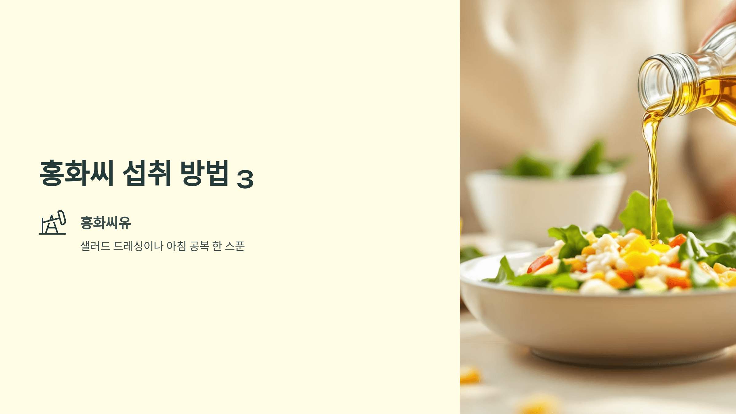 - 홍화씨유: 샐러드 드레싱이나 아침 공복 한 스푼
