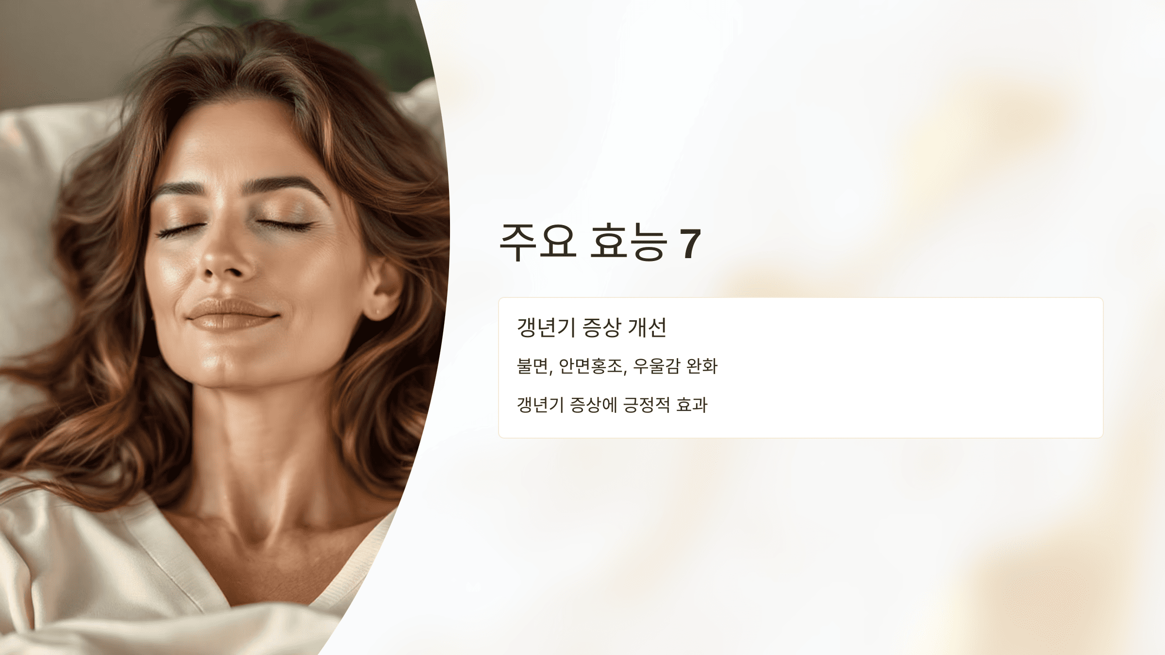 갱년기 여성에게 흔히 나타나는 불면, 안면홍조, 감정 기복 등의 증상을 완화하는 데 효과적입니다.