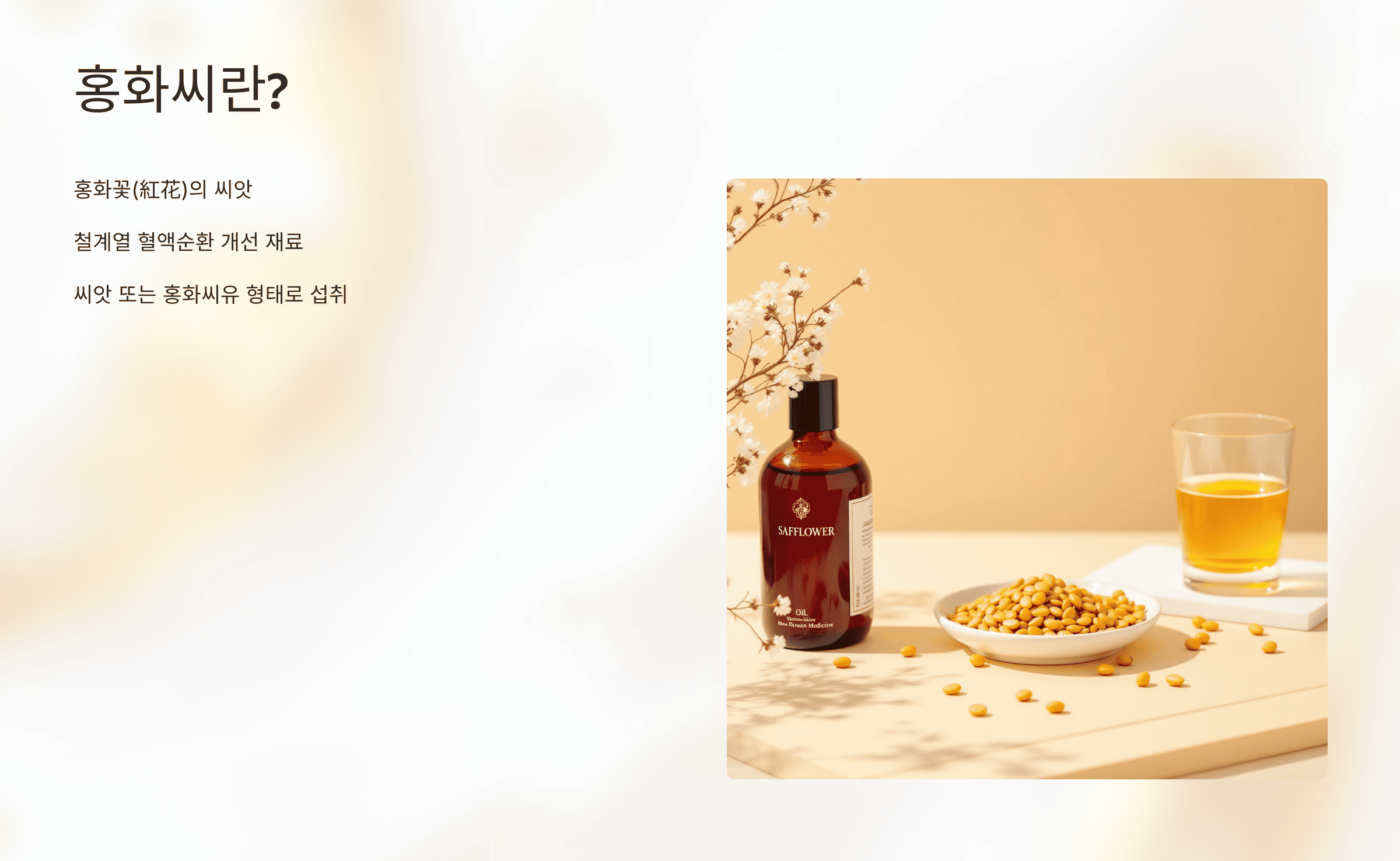홍화씨를 꾸준히 섭취하면 속부터 차오르는 건강한 피부 컨디션을 느낄 수 있어요.