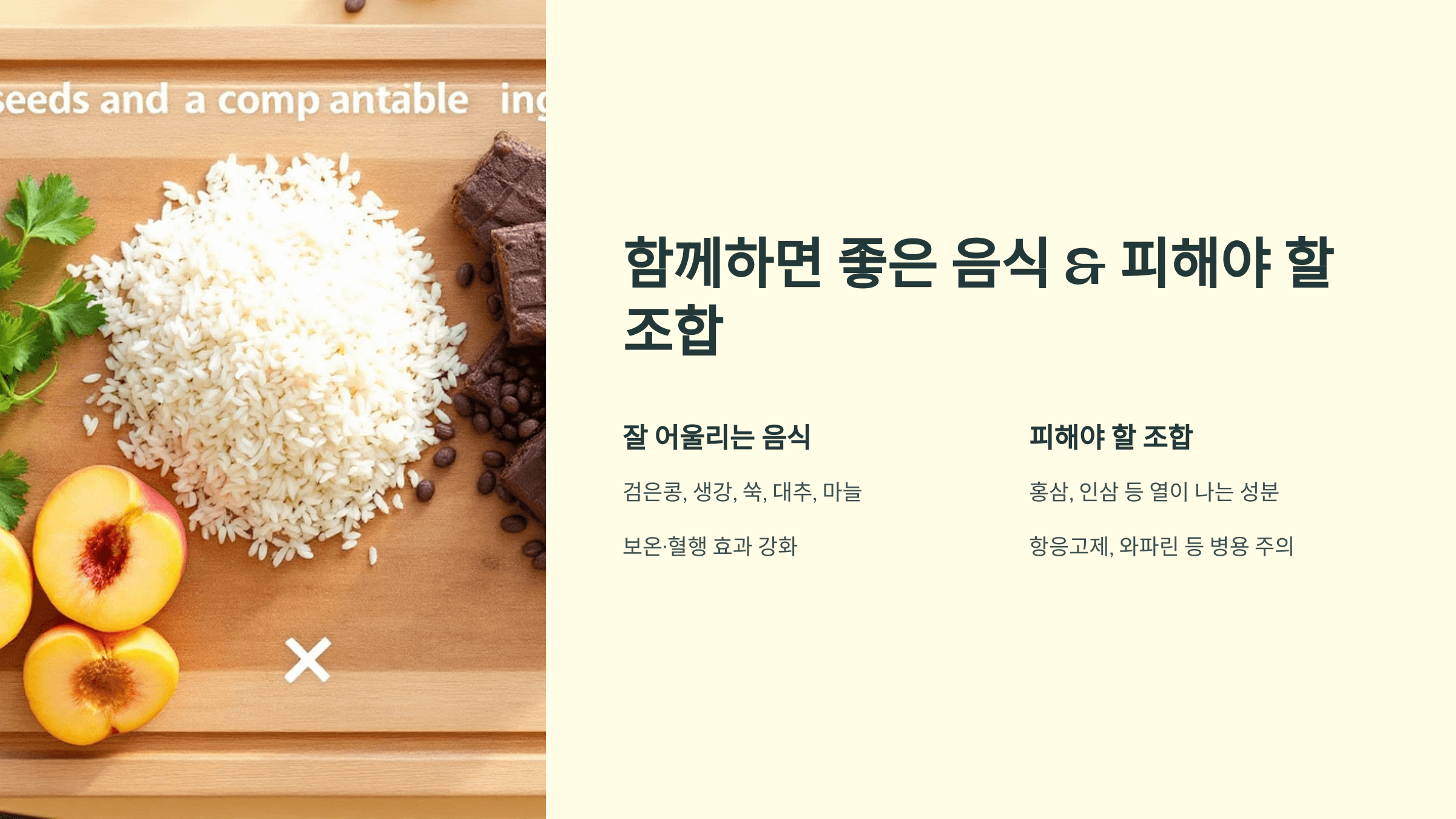 - 검은콩, 생강, 쑥, 대추, 마늘 등과 조합하면 보온·혈행 효과 강화